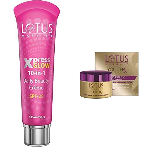 Lotus Make-up Xpress Glow 10 in 1 Daily Beauty Creme Royal Pearl| SPF 25 | 30g And Lotus Herbals Youthrx Anti-Ageing Transforming Creme 50g