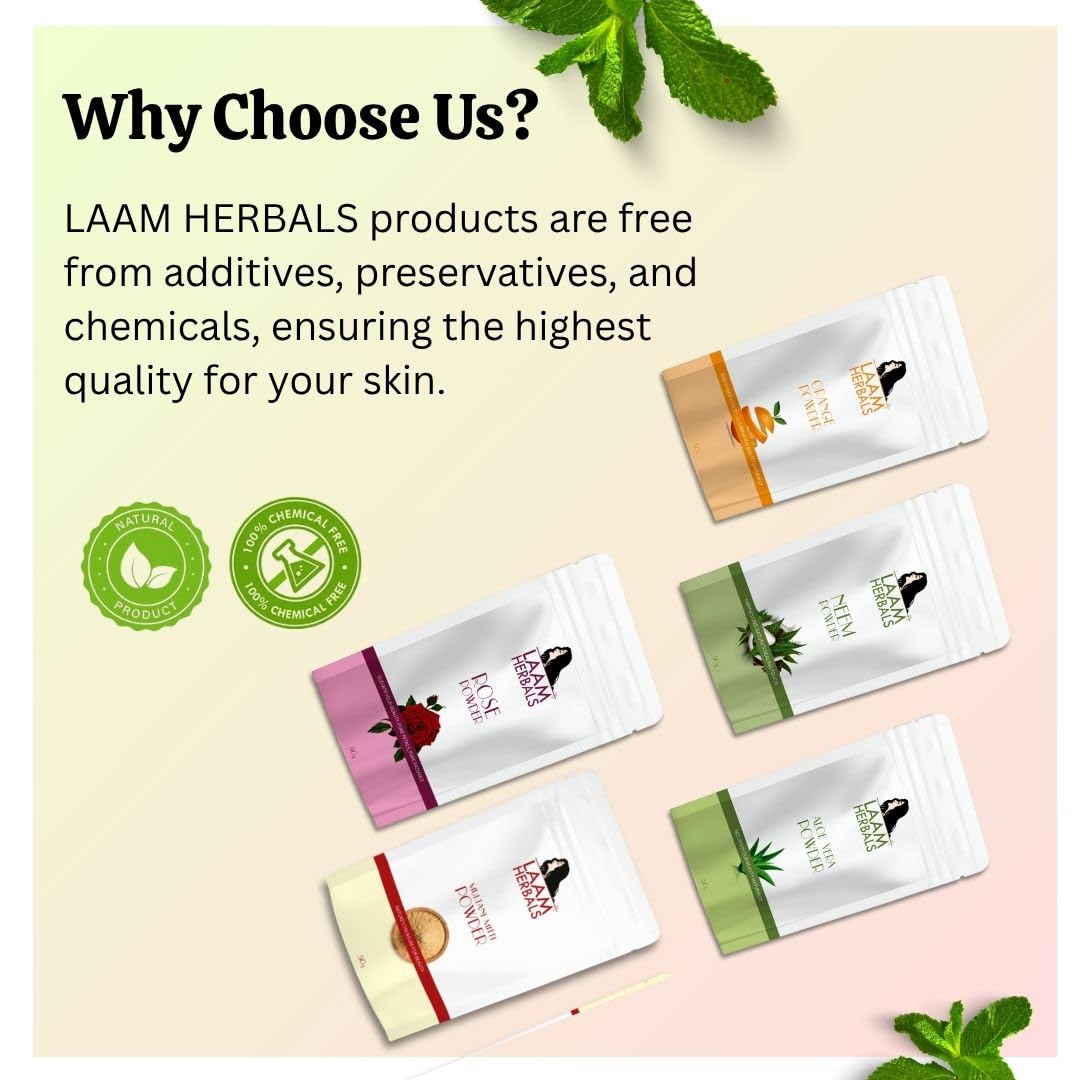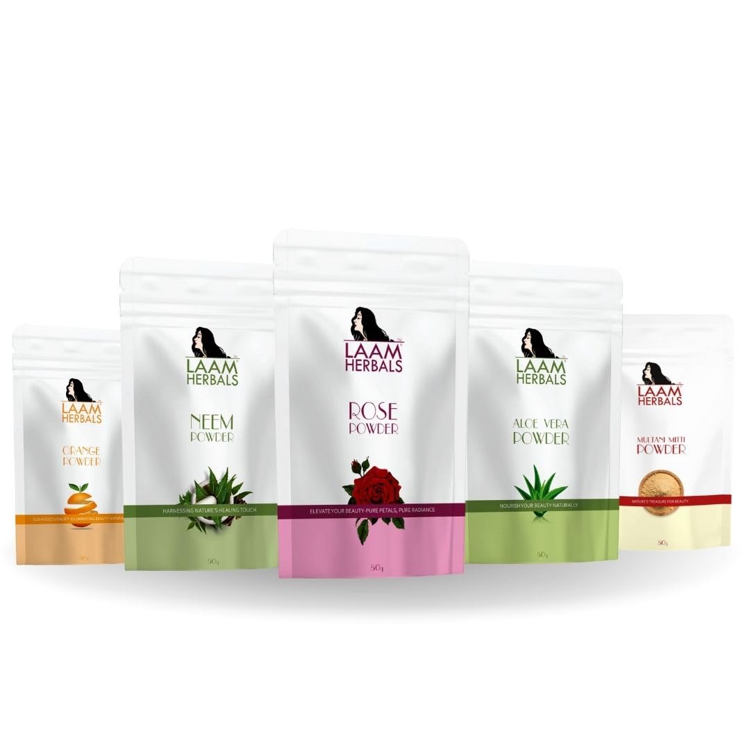 Laam Rose Petal Orange Peel Multani Mitti Aloe Vera Neem Leaf Powder. These powders are prepared by drying the freshly selected petpeels leaves and woods into shade then these dried petpeels leaves and woods is then passed through a heat machine which completely dries them further by sucking the remaining moisture in them. At last it is grounded to powder form through the triple-shift process which makes it a lump-free powder that is easy to apply over face & Hair. After grinding the powder are packed in a clean environment to ensure the proper hygiene of the product. To produce a high qualtiy of product Nothing is added or taken away from these powders.