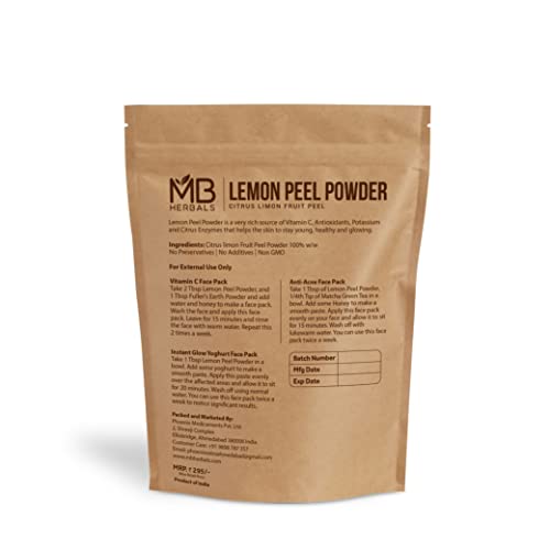 MB Herbals Lemon Peel Powder 100g | for Face Pack | External Use Only | Skin Care Formulations MB Herbals Lemon Peel Powder 100g. Processed from Sun-Shade Dried Lemon Peel. Our LemonPeel Powder is 100% Pure and Natural. No Preservatives. No External Additives. Lemon Peel Powder can be used along with Fullers Earth to make Vitamin C enriched natural face pack for face. Lemon Peel is rich in Vitamin C an essential Anti-Oxidant that refreshes the skins and offers deep cleansing. Lemo has an astringent effect on skin leaving the skin fresh and clean. Face Pack: Take 2 Tbsp Lemon Peel Powder and 1 Tbsp Fuller's Earth Powder and add water and honey to make a face pack. Wash the face and apply this face pack. Leave for 15 minutes and rinse the face with warm water. Repeat this 2 times a week. Face Pack: Take 1 Tbsp Lemon Peel Powder in a bowl. Add some yoghurt to make a smooth paste. Apply this paste evenly over the affected areas and allow it to sit for 20 minutes. Wash off using normal water.