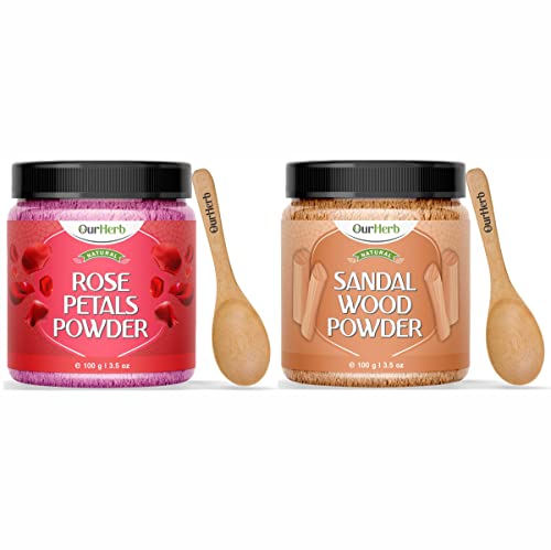 OurHerb Rose Petal Powder is 100% natural made using handpicked & organic ingredients. Which can be used on Face and Hair. Rose Petare the loose petof the fragrant flower Rose which are enriched with a lot of Vitamins. Dried Rose Petare crushed to make Natural Rose Petal Powder. Rose oil and Rose water have been used by women across the world to nourish their Hair and Skin. Rose Petal Powder is extremely beneficial for Hair and Skin. Various pastes can be made with Rose Petal Powder by mixing it with other Natural Ingredients as per the requirement.OurHerb Sandalwood Powder Face Pack is 100% natural made using handpicked & organic ingredients. Which can be used for Skin Care. Sandalwood or Chandan is greatly valued in Ayurveda for its incredible health and beauty benefits. It is used since times immemorial all over the world for its umpteen properties and also used widely in religious ritu. It has a distinct gentle warm velvety and woody scent which offers an everlasting base to perfumes. This aromatic wood is ground into a powder. Sandalwood is highly valued for its pure natural and potent properties.Package Contents : 1 x Plastic Jar Packed OurHerb Rose Petal Powder 100g with Attractive Wooden Spoon. 1 x Plastic Jar Packed OurHerb Sandalwood Powder 100g with Attractive Wooden Spoon.