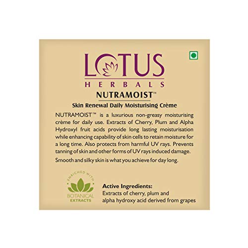 Lotus Herbals Nutramoist Skin Renewal Daily Moisturising Creme SPF 25 50gLotus Herbals Nutramoist Skin Renewal Daily Moisturising Creme SPF-25 : • Soft fluffy textured cream • Gel-cream consistency and nice heavenly fruity fragrance • Spreads easily • Softens and smoothens skin and improves skin texture • Very little is required for one use hence will last longer • Easily available • Affordable as it would cut down the expense of hydration/moisture masks • Intensively moisturising