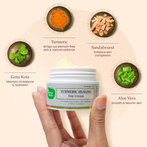 Mother sparsh Turmeric Healing Day cream is an Ayurvedic blend of gotu kola turmeric and aloe vera to heal dark spots. The light-weight and fast absorbing formula of this natural face cream makes it the perfect daily dose of turmeric moisturisation for all skin types. Sandalwood oil and Turmeric oil in this dark spot removal cream helps to brighten your skin and heal pigmentation. Soothing texture and hydrating property of this elite face cream nourishes your skin from within and impart natural resilience. The promising infusion of anti-aging ingredients helps to keep your skin fresh and youthful for a longer time. Use it daily and see the amazing result yourself.