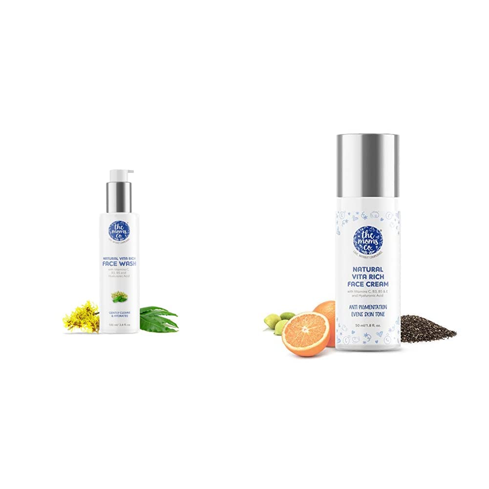 The Moms Co. Natural Vita Rich Face Wash | All Skin Types | With Vitamins C B3 & B5 Neem Extract and Witch Hazel (100ml)Our natural face wash enriched with vitamins c B3 & B5 gently cleanses skin leaving it soft glowing & hydrated.The Moms Co. Face Cream 50 mlOur Vitamin Rich Face Cream with Chia Seed Oil Kakadu Plum and Hyaluronic Acid replenishes skinâs moisture and helps reduce pigmentation & fine lines for smoother radiant looking skin.