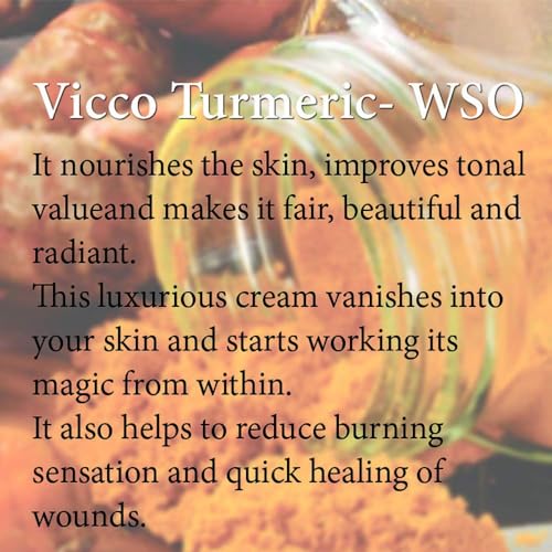 Turmeric is known for its aromatic and antiseptic properties. Vicco Turmeric WSO Cream has all these attributes and much more for your skin to benefit from. Pure turmeric powder in cream base inherent in this formulation is very useful in dermatological disorders like boils pimples acne allergic rashes nappy rashes and itching. It also helps to reduce burning sensation and facilitates healing of wounds. Regular use of Vicco Turmeric WSO Cream improves tonal quality of skin making it radiant. A must cream for every household !