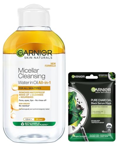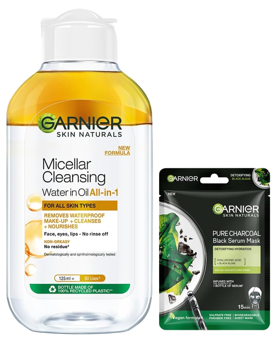 Garnier Skin Naturals Cleansing Water for Waterproof Makeup Nourishing Formula Micellar Oil-Infused Cleansing Water 125mlGarnier Micellar Oil-Infused Cleansing Water is a make-up remover that removes make-up and other impurities from your skin easily. It is enriched with cleansing molecules called Micelles that attract make-up and other impurities lifting them away from your pores â just like a magnet. No rubbing is needed. How to use â Shake the bottle pour it onto cotton press lightly on the skin for a few seconds and wipe away gently. The proof is on the cotton. Garnier Micellar Oil-Infused Cleansing Water is perfect for heavy and waterproof make-up. If lighter make-up is more your style you can try Garnier Micellar Cleansing Water.Garnier Skin Naturals Face Mask Hydrating & Detoxifying Black Serum Mask Pure Charcoal 1 pc 28gGarnier Serum Sheet Masks give your skin a facial-like glow in just 15 mins and helps brighten it instantly. The Charcoal Face Mask is a breakthrough black tissue mask technology that offers double purifying and hydrating efficacy. Use the Garnier Black Serum Mask if you have dull skin with clogged and enlarged pores. The serum mask will intensely hydrate and purify your skin while also tightening its pores. The sheet mask has been dermatologically tested. Suitable for all skin types including sensitive skin