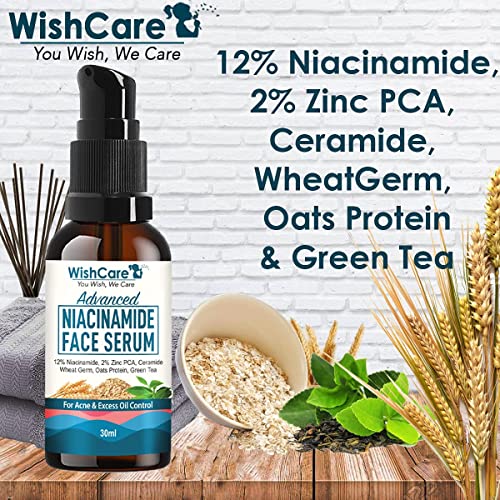 WishCare Advanced 12% Niacinamide Serum for Acne, Acne Marks, Blemishes & Oil Balancing with 2% Zinc, Ceramide Oats, Green Tea - 30ml, Natural (WCNS30)