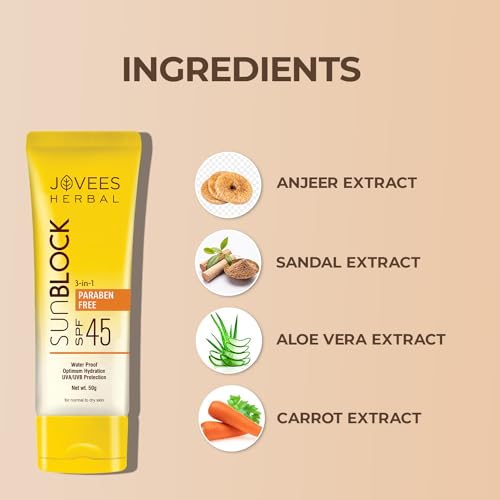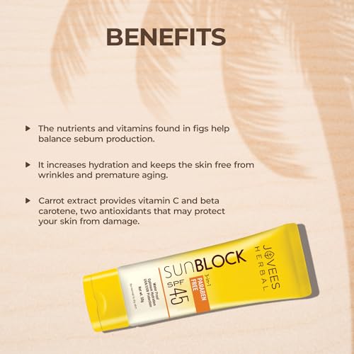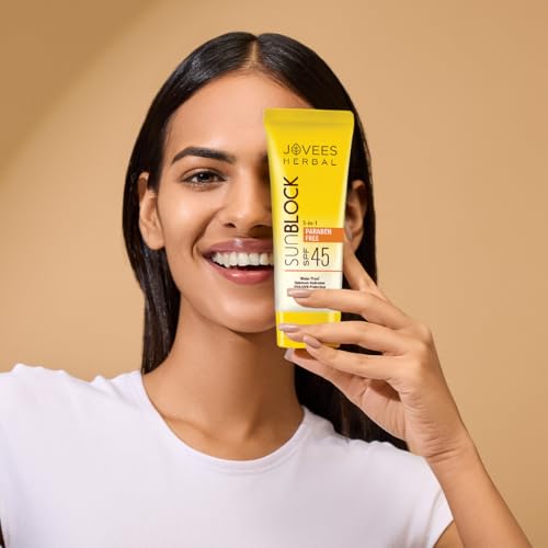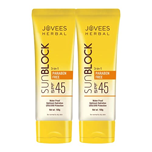 HomeHealth & PersonalSkin CareFace CareSunscreenJovees Herbal Sun Block SPF 45 For Even Toned & Glowing Skin | Suitable For Dry Skin | Sunscreen for UVA/UVB & Blue Light Protection | Lightweight & Non Grassy for Men & Women 100g (Pack of 2)