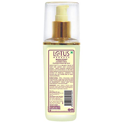 Refresh Your Skin With A Dash Of Basil Cucumber What your skin needs after a day of wear and tear is the soft natural care of Lotus Herbals Basiltone Cucumber & Basil Clarifying & Balancing Toner. This natural toner is packed with goodness of basil and cucumber which work on your skin to remove any make-up residue pollutants or excess oil and prepares it for moisturization. This gentle skin toner evens out your skin tone and balances PH levels to give you refreshed looking radiant skin! Cucumber Extracts Cucumber is a natural astringent which cools your skin and helps cleanse it of excess oils. It hydrates dull looking skin making it look fresh and radiant. It is also rich in proteins and lipids which nourish your skin keeping it soft supple and touchable for long hours. Basil Leaf extracts Basil leaf extract is loaded with antioxidant anti-fungal and anti-bacterial properties which breathe new life into dull tired looking skin. It lightens skin tone and reduces skin blemishes. It also wards off obvious signs of premature ageing by tightening skin pores. Neem extracts Neem is effective in lightening scars and skin pigmentation. It evens out your skin tone and imparts a soft natural glow. It is also acts as a natural moisturizer and keeps your skin soft and supple all day long.