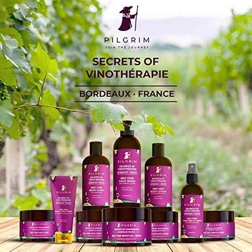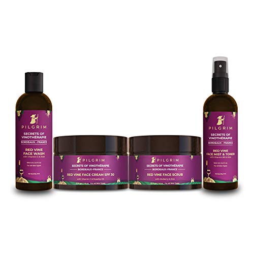 """Treat your skin to a lavish self care ritual that includes five steps to deep cleanse refine and revitalize for a more balanced and young looking skin. The sulphate-free cleanser gently lifts off daily grime and pollution while infusing the skin with moisture that firms and lifts. Restore balance vitality and moisture with the luxurious Red Vine Toner & Mist. The pilgrim Red Vine Face Scrub unclogs pores prevents blackheads and boosts circulation to keep the skin luminous young and soft. It sucks out impurities from deep within for tighter pores and visibly refined skin. Boosts water saturation for an instant face lift and imparts the skin with a flush glow. The unique multitasking day cream with SPF nourishes the deepest layer of dermis and protects it from photoaging."" The most important and unmissable step in your daily morning routine for fresh firm & healthy skin. Keep glowing all day long!"