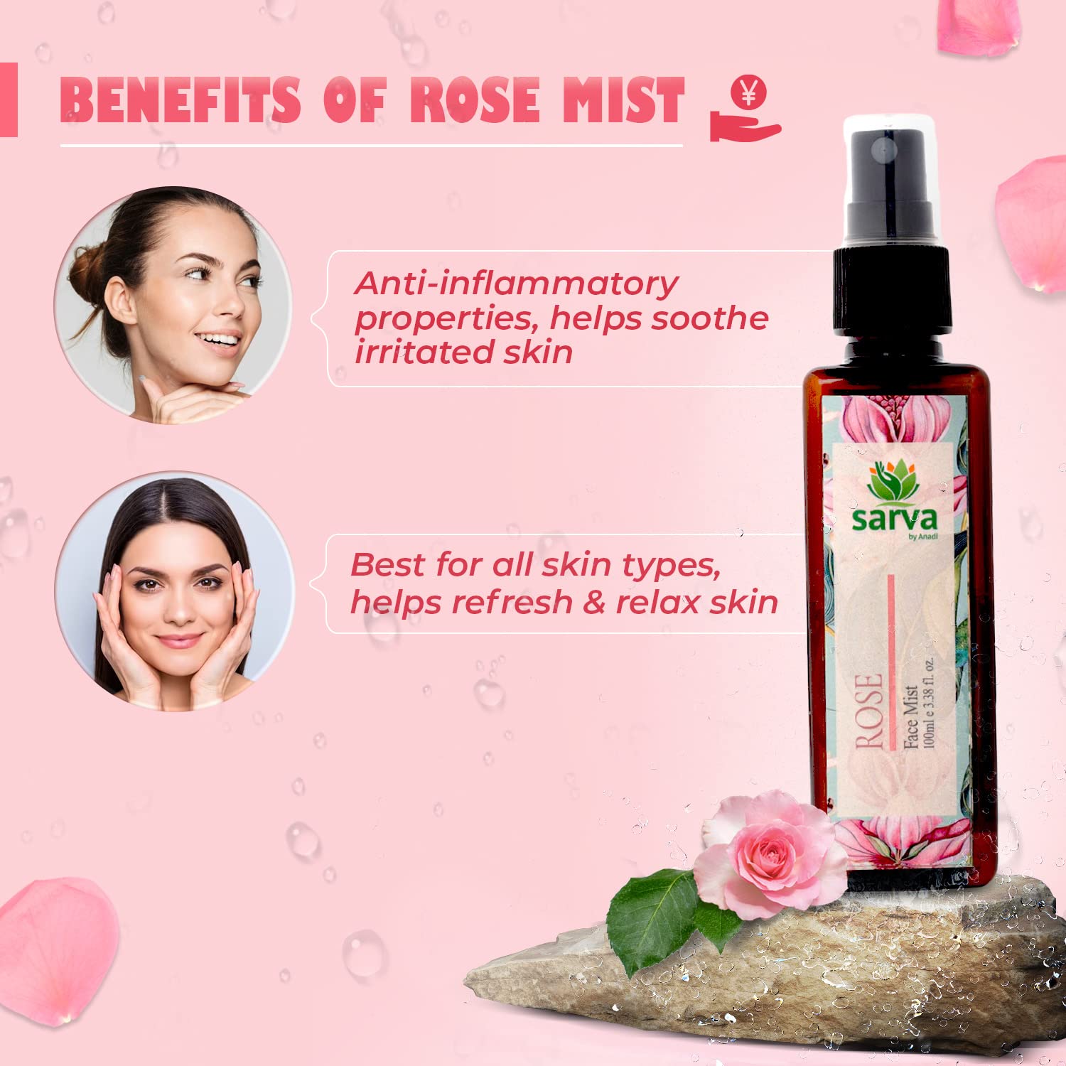 Rose Mist From Sarva By AnadiRose Mist Is Pure 100% Natural Steam Distilled Hydrosol Which Acts As A Mist And Toner To Your Face And Body. Rose Mist From Sarva By Anadi Is Created By Steam Distillation Of Petals Of Rosa Damascena.It Contains Numerous Powerful Antioxidants Which Can Help Protect Cells From Damage. Calming And Floral Aroma Acts As A Refreshing Toner Which Hydrates And Revitalizes Skin. This Soothing Water Improves Skin Texture Strengthens Skin Cells And Regenerates Skin Tissues. . Sarva by Anadi represents a collection of pure and natural products originated in India. Size: 100ml e 3.38 fl. OzRose Face Mist Caters To Host Of Amazing BenefitsActs As A Skin Toner Maintaining Ph Balance Make Up Remover Acne Fighter And Pore Cleanser.It Is An Anti-inflammatory And Helps To Reduce Redness In The Skin.It Has Antiseptic And Antibacterial Properties Which Helps Wounds Heal Faster By Keeping Them Clean And Fighting Injections.It Has Antidepressant And Anti-anxiety Properties.It Has Anti-ageing Properties Thus Helps To Reduce/Prevent Wrinkles Blackheads And Whiteheads. 6. Best Suited For All Skin Types And Is A Unisex Product.Directions For Use Spray Directly On Face/Body Keeping A Slight Distance With Eyes Closed.There Is No Need To Dilute The Hydrosols.Keep Your Rose Hydrosol Refrigerated For Enhanced Soothing And Refreshing Effect.Use It To Blend With A DIY Face MaskSerums and Moisturizers.Add It To Your Bathwater To Promote Softer Renewed Skin and For A Relaxing Aromatherapy Session.ForewarningFor External Use Only. Avoid Contact With Eye.Keep Away From Children Under 3 Years.Do A Patch Test On Skin First. User Discretion Required.