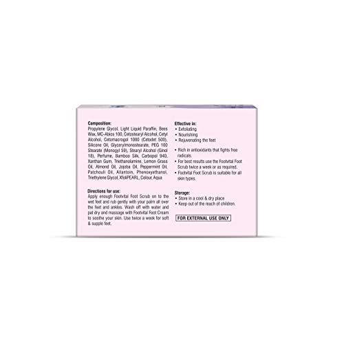 REJUVENATES FEET: Footvital Foot Scrub helps invigorates and rejuvenates the dull & dry and help maintain your feet fresh & relaxed. It also helps minimizing tanning around feet areas & soles.