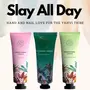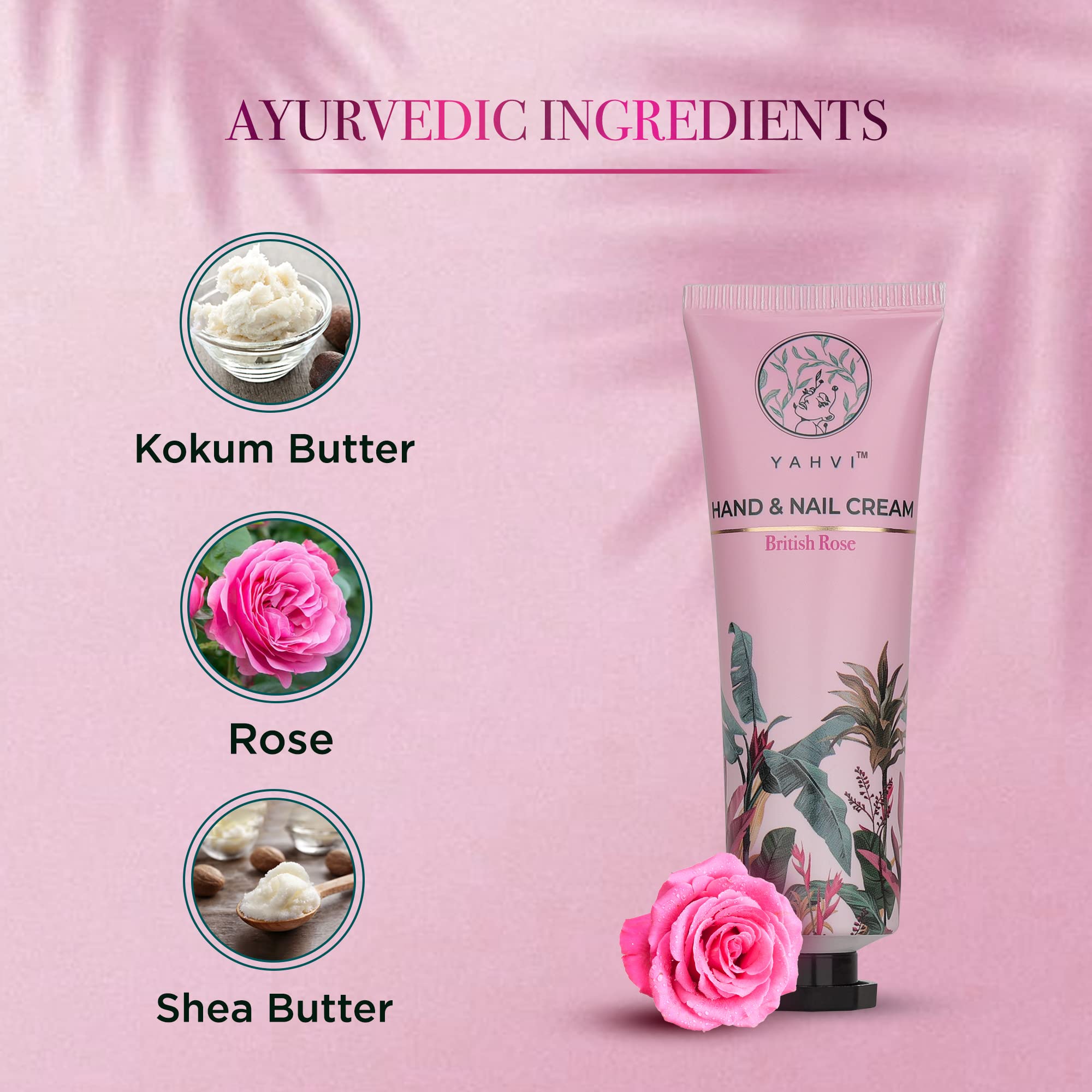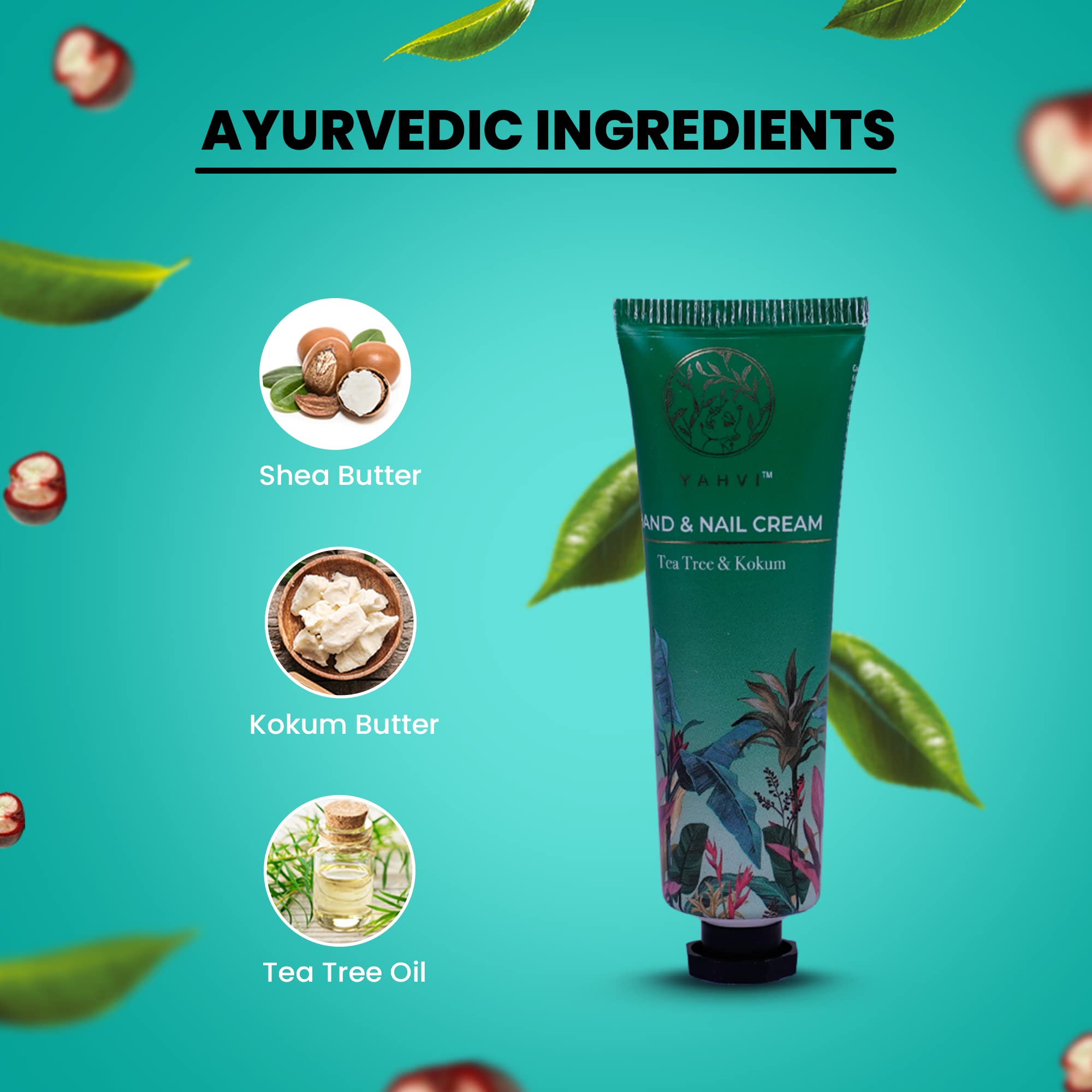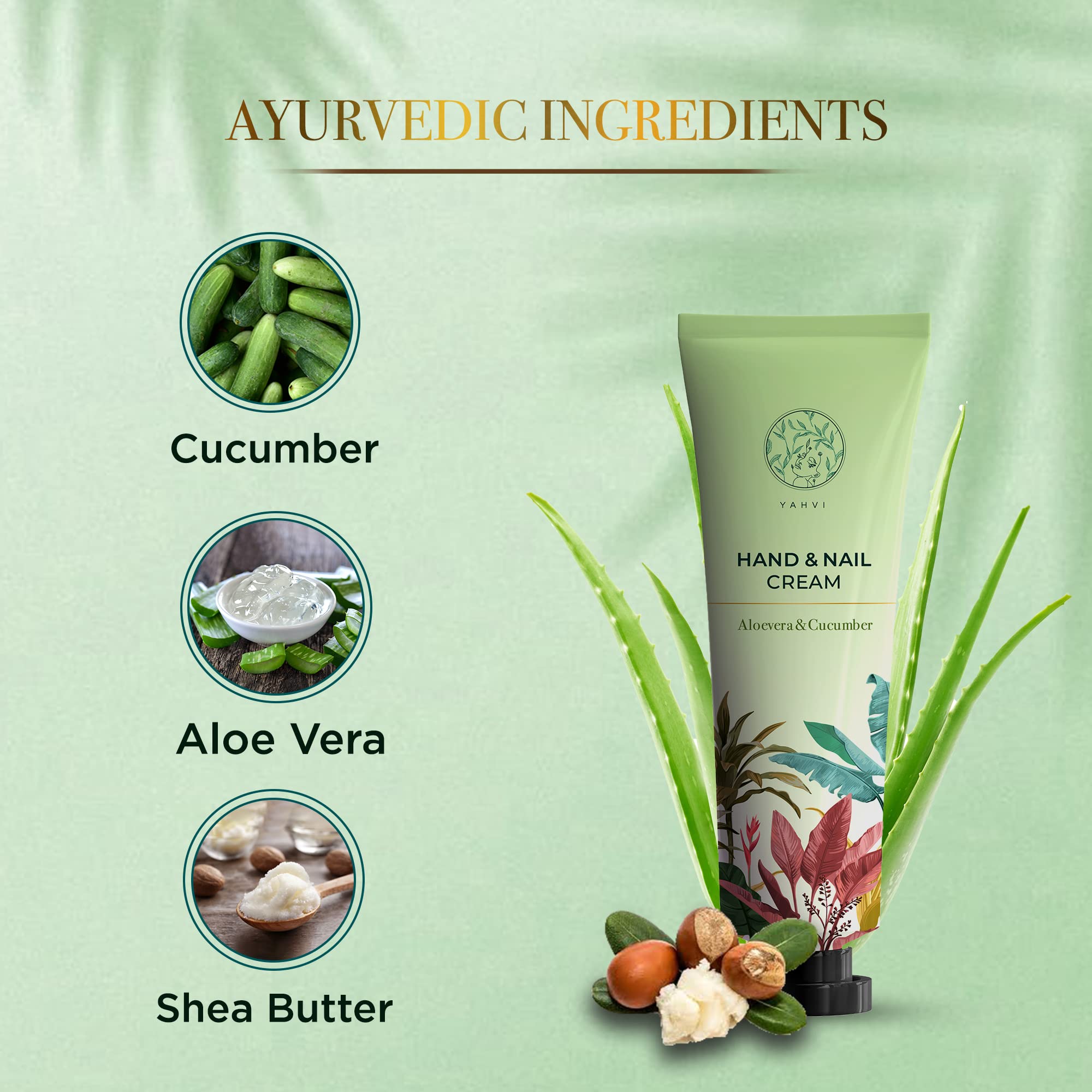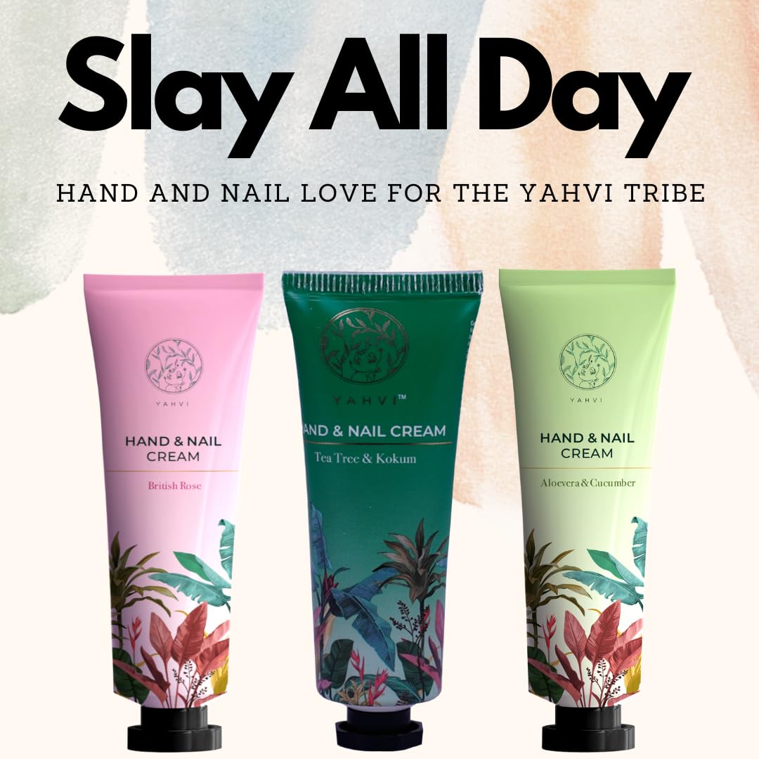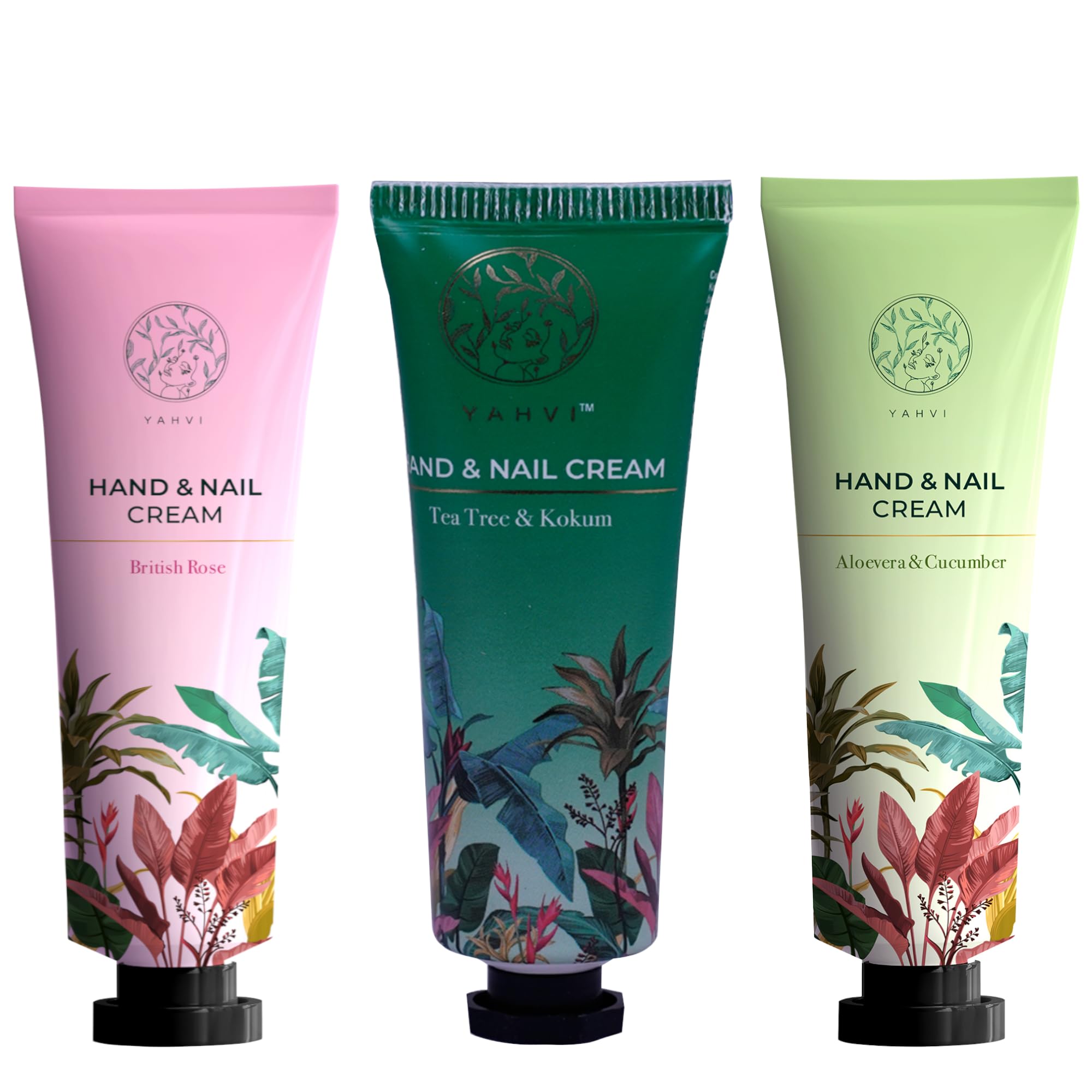 Introducing Yahvi Hand & Nail Cream Combos - the ultimate solution for your hand and nail care needs! Enriched with nourishing Kokum Shea Butter and Tea Tree Oil our deeply nourishing formula revitalizes dry and rough hands leaving them soft supple and healthy. Say goodbye to weak brittle nails as our complete nail care solution helps strengthen and groom them achieving a polished and put-together look. Experience the joy of radiant skin with our powerful ingredients that regenerate your complexion giving you a youthful and even-toned glow. Infused with the goodness of Ayurveda our combo featuring Rose Aloe Vera & Cucumber provides a mineral-rich boost for younger-looking healthier hands. Embrace a sensory journey with our multi-scent combo - Kokum & Tea Tree British Rose and Aloe & Cucumber - delighting your senses with every use. Our products embody compassion and kindness as they are cruelty-free and paraben-free making them not only great for your skin but also ethical for the environment. Suitable for all skin types our hand and nail cream combo naturally heals evens tones and hydrates leaving your hands nails and cuticles nourished and revitalized. Indulge in the complete hand and nail care experience with Yahvi Hand & Nail Cream Combos. Our Ayurvedic formulation deeply nourishes and hydrates delivering soft healthy and youthful-looking hands. Experience quick absorption and non-greasy formulas that make your self-care routine a breeze. Strengthen your nails and promote a polished appearance enhancing your overall beauty. With our value pack enjoy the luxury of affordability without compromising on quality. Treat yourself or surprise your loved ones with this fantastic combo offering royalty-worthy hands and naturally radiant skin. Elevate your self-care routine and embrace the beauty of Ayurveda combined with modern science. Discover the joy of naturally beautiful hands with Yahvi Hand & Nail Cream Combos.