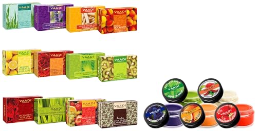 VAADI HERBALS Assorted Luxurious Handmade Herbal Soaps, 75g (Pack of 12) & Assorted Lip Balms, 10g (Pack of 5) 100% Natural Lip Balms| For Dry & Chapped Lips | 24hr Hydration |