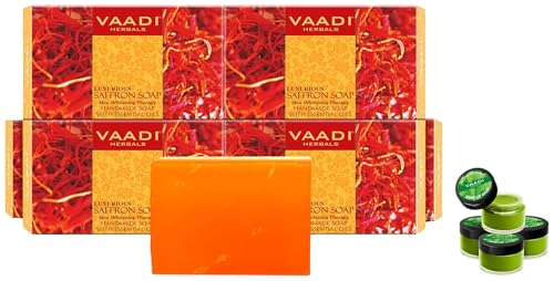 HomeBeautyBodyBath & ShowerSoapsVAADI HERBALS Value Lip Balm, Mint, 4 x 10g & Super Value Luxurious Saffron Skin Whitening Therapy Soap, 75g (Pack Of 6)