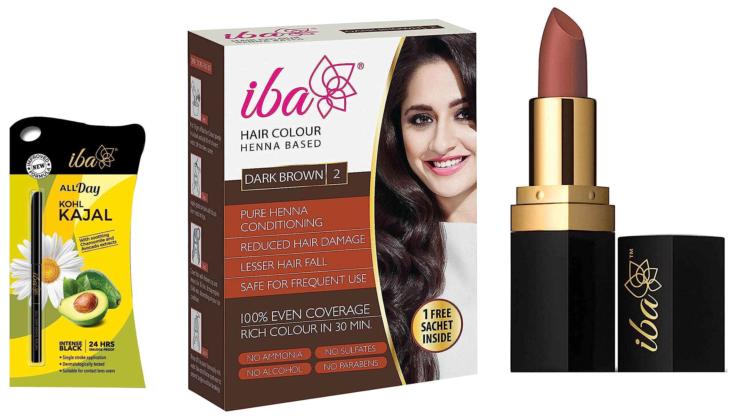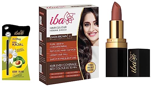 Iba Lips Long Stay Matte Lipstick M15 Cinnamon Chai l 100% Vegan & Natural l Highly Pigmentated l Long LastingIba is proud to present India's first range of halal certified and vegan lipsticks which are 100 percent free of pig fat lanolin carmine other animal-based ingredients and harmful preservatives such as parabens. Instead find lip-loving ingredients like shea butter coconut oil aloe vera and vitamin e in our rich and creamy lipsticks.Iba Hair Color Free Sachet Dark Brown 70 gr l No Ammonia l Sulfate Free l Long Lasting ColorIba Halal Care brings you trusted natural benefits of pure henna in a range of colours with its new hair colour range. Unlike chemical hair dyes Ibaâs ammonia free henna based formula will colour your hair without damaging your hair structure to give you naturally colored beautiful hair.Iba All Day Kohl Kajal Jet Black 0.35g l Smudge Proof l Waterproof l 24 hr Long Lasting l Vegan & Cruelty FreeGive your eyes a youthful and intense look with iba all day kohl kajal. Its 24 hour smudge proof water proof and intense black formula is suitable for all day wear. Enriched with soothing jojoba oil and free from harsh chemicals and parabens iba all day kohl kajal is also suitable for sensitive eyes and contact lens wearers.