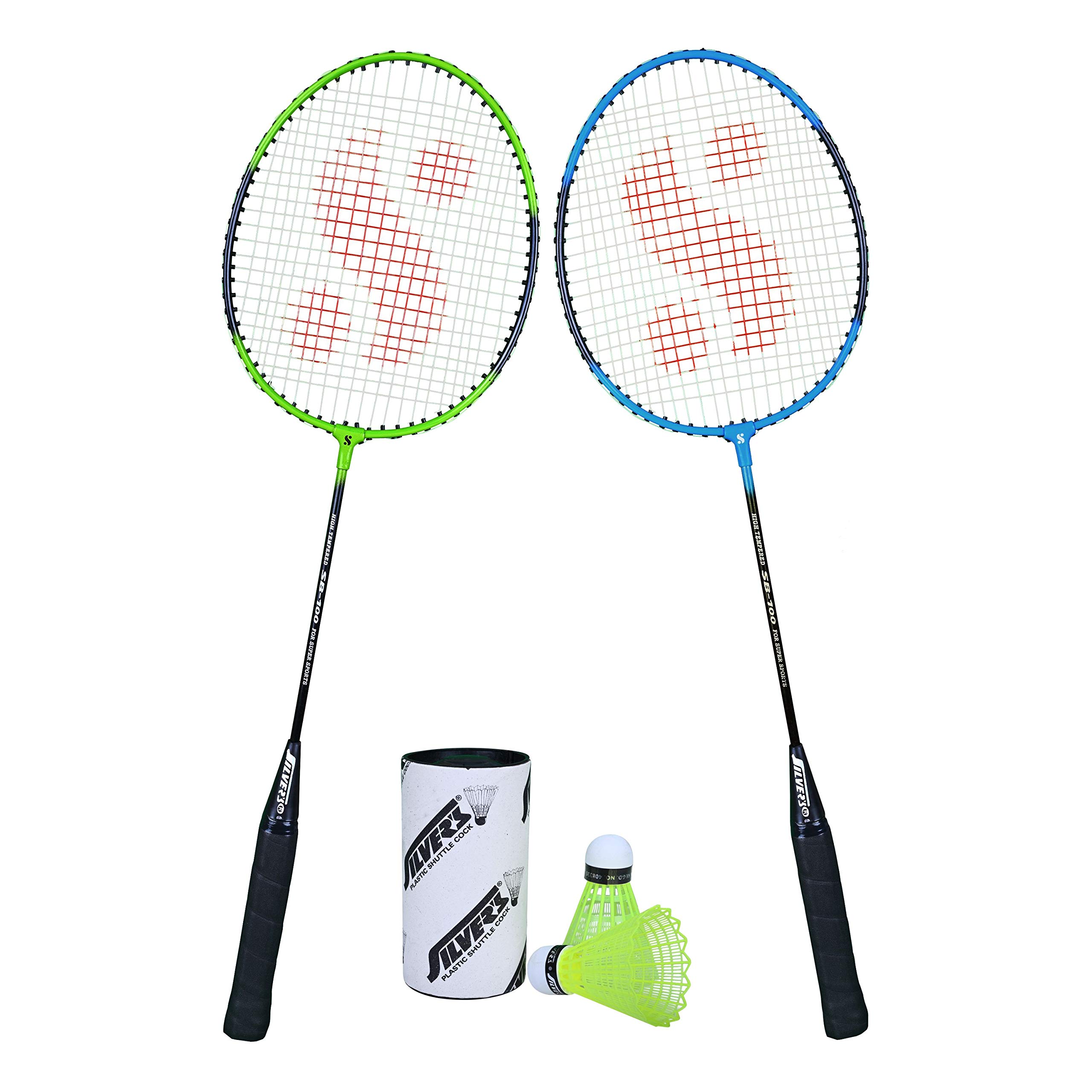 Silver's SB-100 Combo-2 (2 B/Badminton Rackets with 1 Full Cover + 2 Pcs Plastic Shuttle) Green-Blue Steel