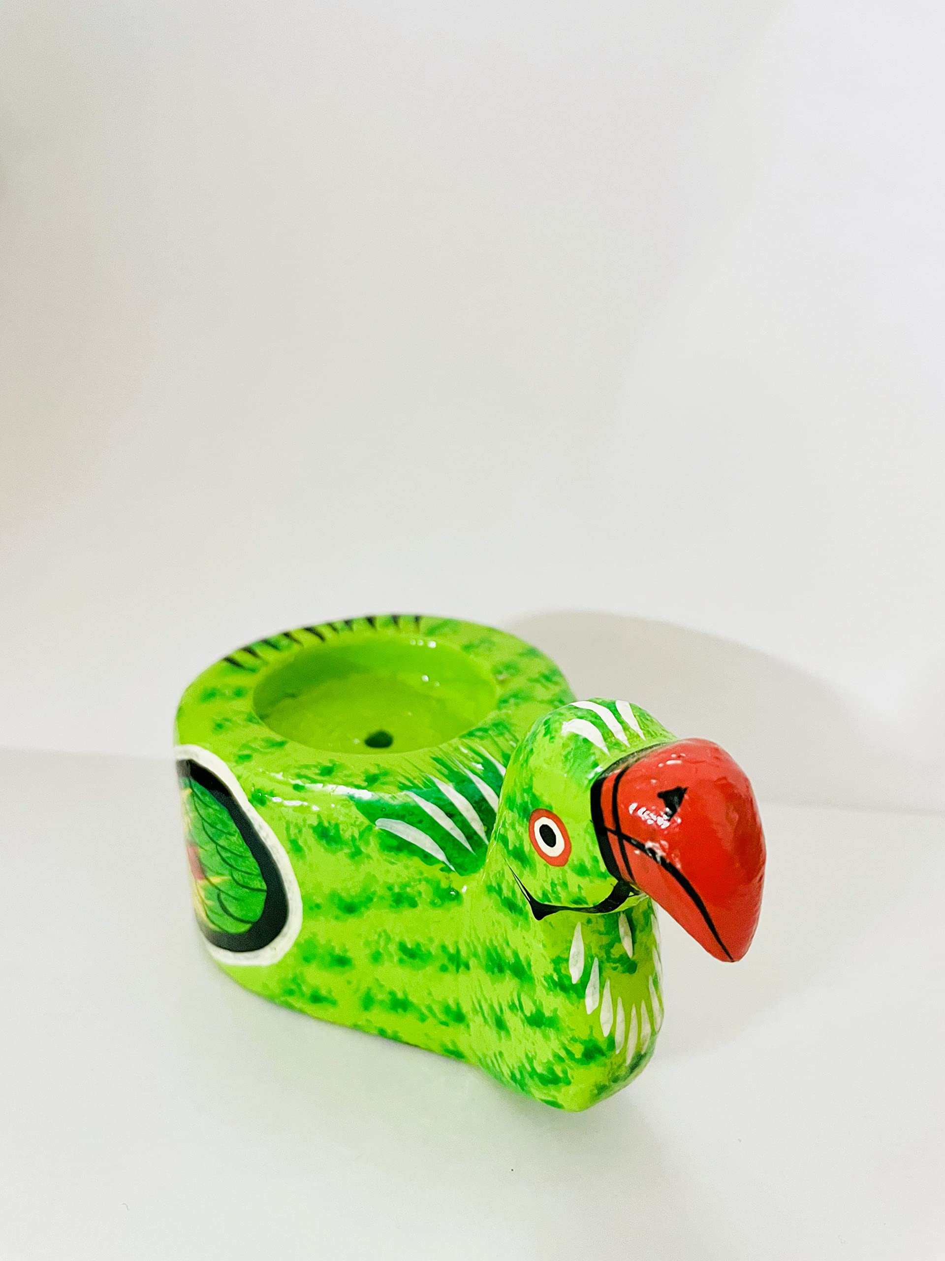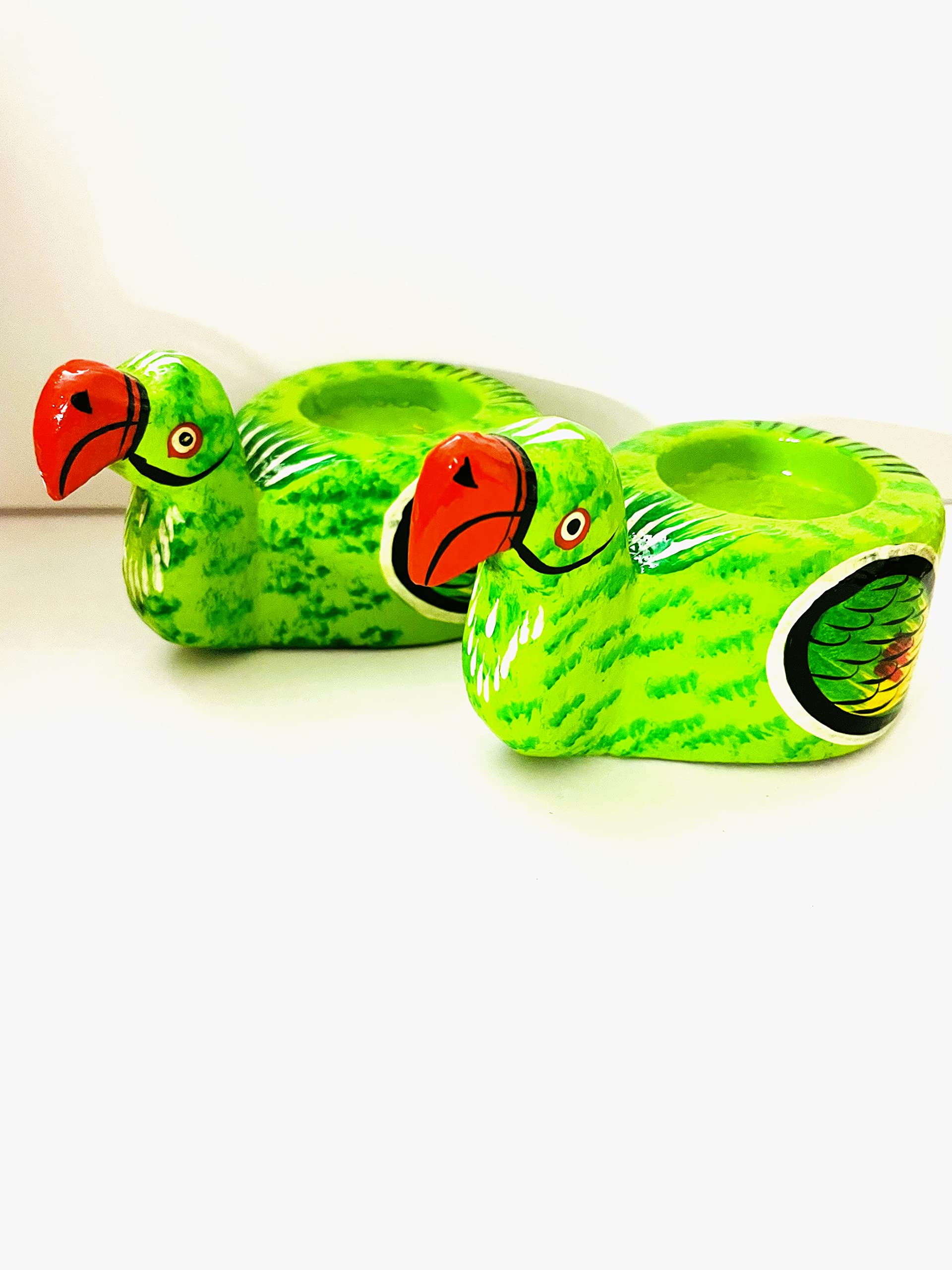 These VARANASI WOODEN TOYS handmade and hand painted Parrot Pair candle stand add oodles of creativity and elegance to your creative range of art pieces of tea light holder. Add a vibe of creativity and class to your interior to enrich its ambiance by these VARANASI WOODEN TOYS Parrot pair candle stands. Best gifts for Diwali Diwali decorations Golu decoration Golu Navaratri Festivals These tea light holders are hand-crafted by rural artisans in India. They are made entirely by hand using traditional skills This T-light Holder work as a T-light holder/candle holder and can even be used in dining rooms and halls for the decoration purpose and parties etc. Also it can be used as a unique gift too and the best and amazing thing about the product is that it shaped like a Parrot. This T-light holder will add charm to your home.
