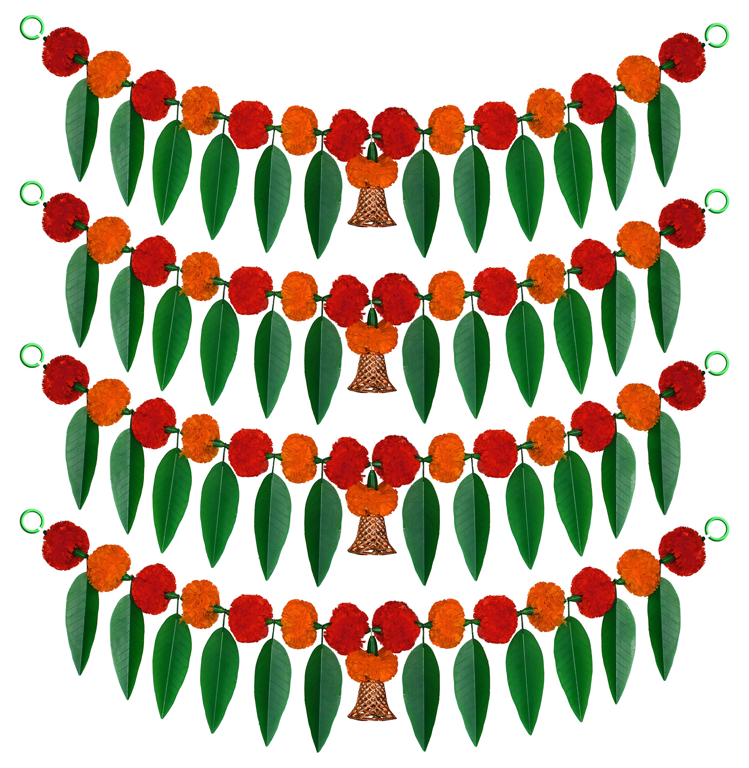 iHandikart Artificial Marigold Flowers with Mango Leaf Door with Bell at The Bottom Hanging Bandanwar|Diwali Decoration Item|Diwali Gift Size 38x8 Inch Colour Red & Light Orange Pack of 4 (31382-4)