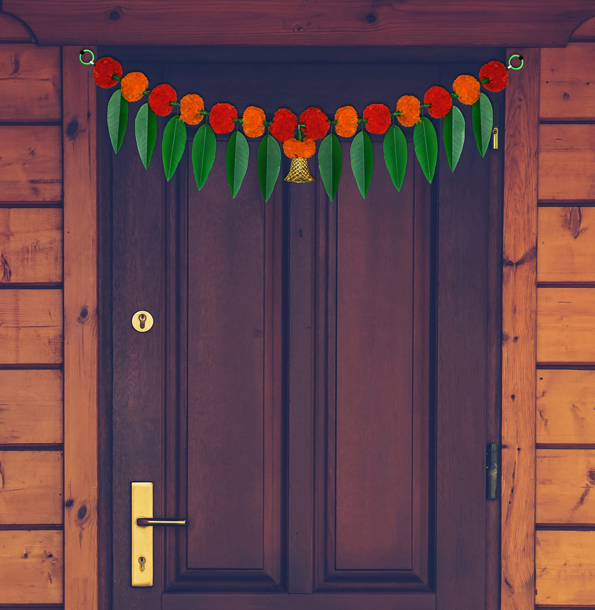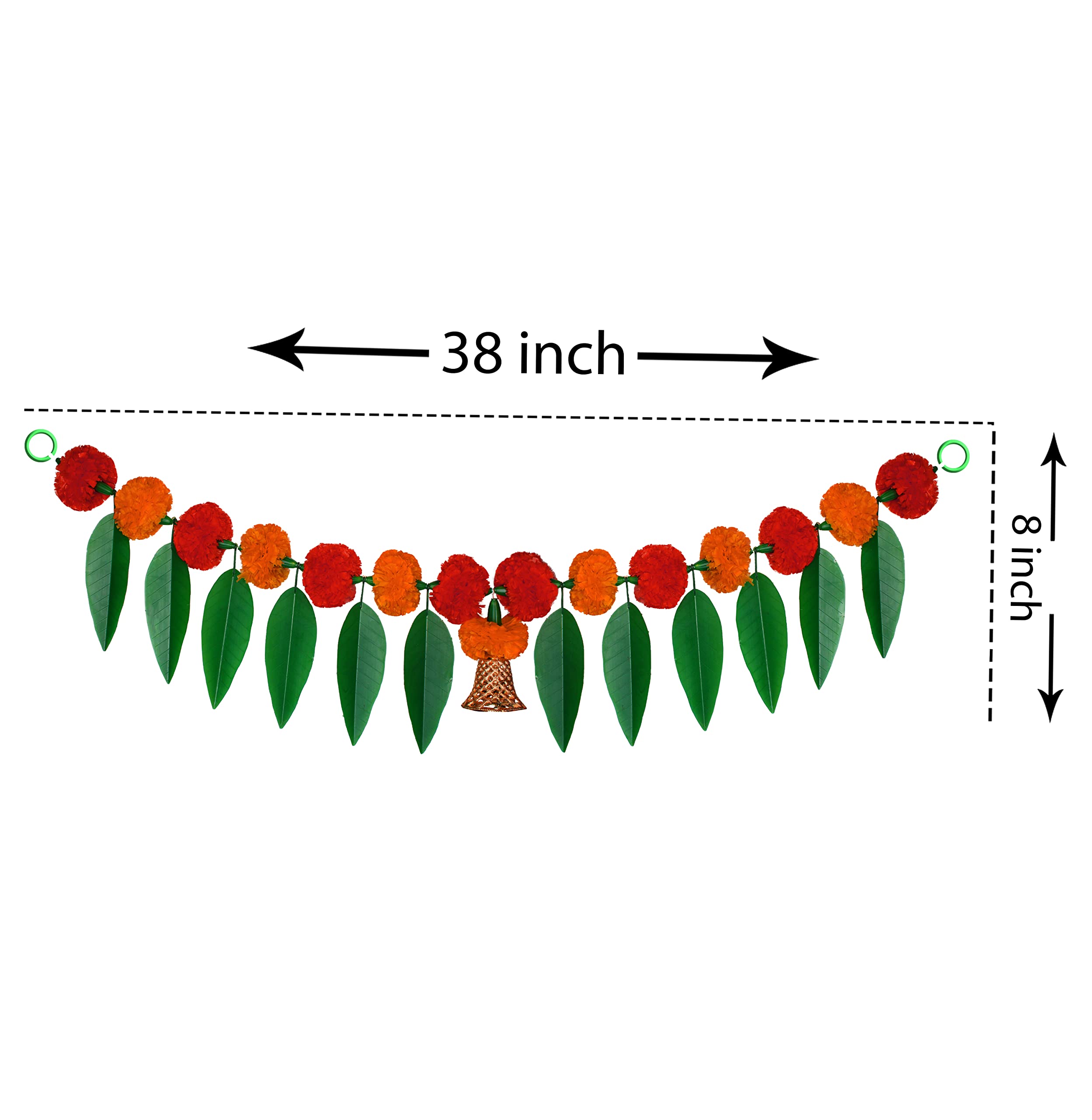 HomeHomeHome AccentDecorative AccessoriesiHandikart Artificial Marigold Flowers with Mango Leaf Door with Bell at The Bottom Hanging Bandanwar|Diwali Decoration Item|Diwali Gift Size 38x8 Inch Colour Red & Light Orange Pack of 4 (31382-4)