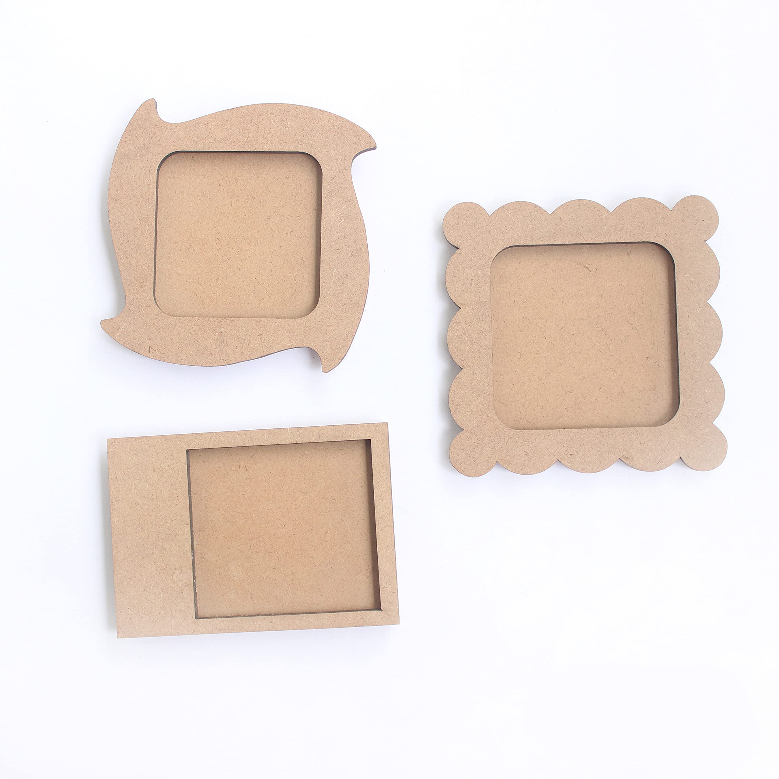 PACKAGE CONTENTS: Set of 3 different shaped photo magnets multipurpose MDF cutouts. Size: Polaroid : 4in X 3in X 0.5 in : Photo Size : 2.7 in by 2.5 in Square : 4 in X 4 in X 0.5 in : Photo Size : 2.5 in X 2.5 in : Scallop : 4 in X 4 in X 0.5 in : Photo S