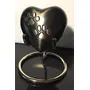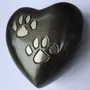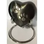 Wonderful pet memorial urn containing a 3 inch metal heart shaped urn with hand carved paw prints on it. Included is a chrome stand to elevate and display the urn. Urn is 3"x1.5" so a small keepsake size. Bottom unscrews to allow you to easily fill it. This Small urn is perfect for saved ashes after scattering the rest. Great for sharing with loved ones as well. As ashes are fine it is recommended to bag before insertion or place a piece of cloth or plastic between the bottom lid and urn to seal in the ashes.