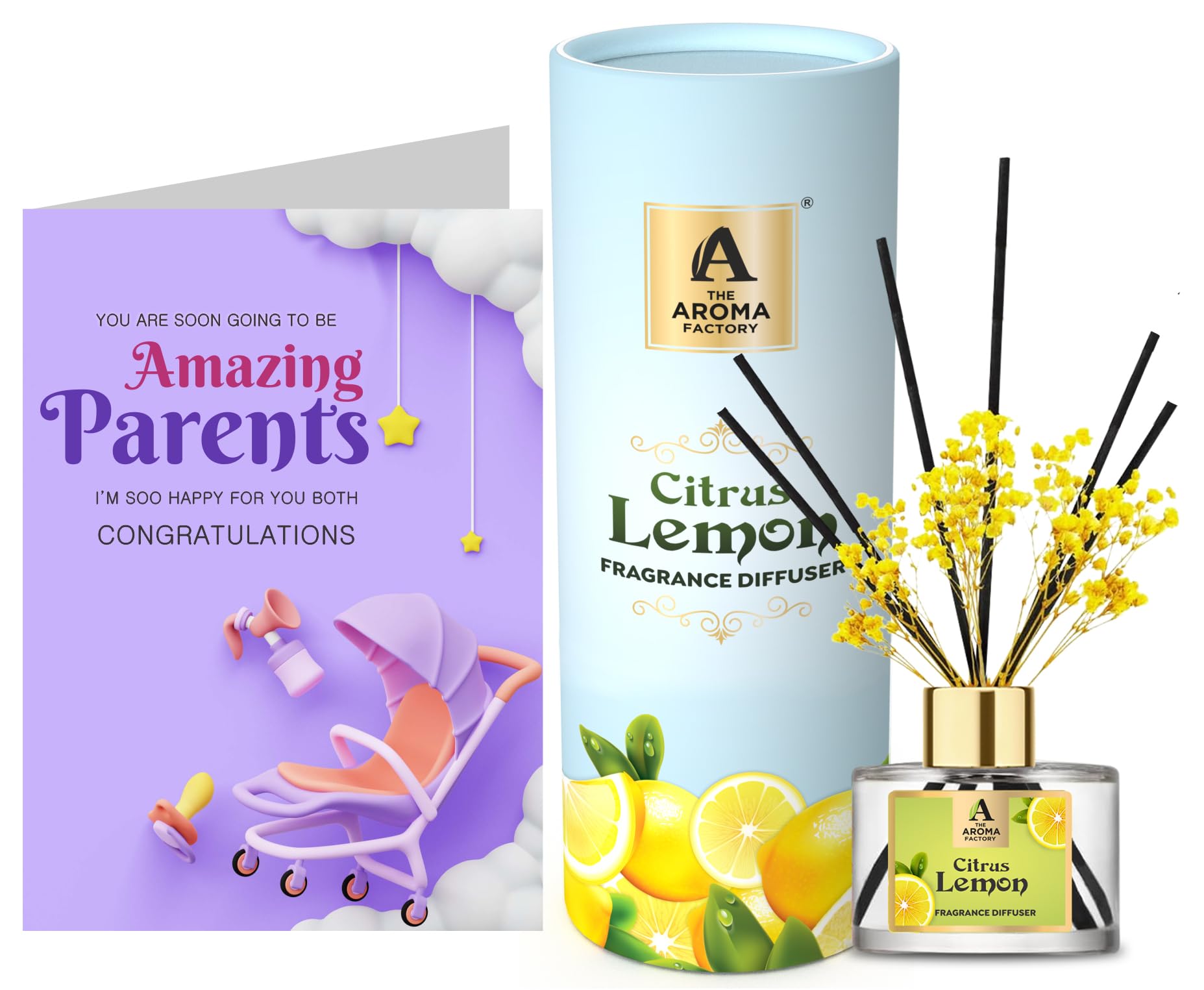 Pregnant expecting couple to be parents Gift with Card hamper gifts best unique for greeting message customised customized personalised personalized candy toffee fragrance scent perfumeThe Aroma Factory Reed Diffusers are perfect gift for friends family. Fresh Fragrance curated by Scented oil essential Perfumers to add magic aromas to your senses. Made using natural essential oils in alcohol free aromatic fragrance base. celebration with greeeting happy cards. Hamper fibre fiber rattan reeds. Refill & Reuse they last upto 60 days based on usage/air at home office spa. Try Our Range : Rose Lavender Lemongrass Citrus Lemon Fresh Active White Sage.The Aroma Factory Pregnant expecting couple / to be parents Gift with Card Citrus Lemon Fragrance Reed Diffuser Set (1 box + 1 card)