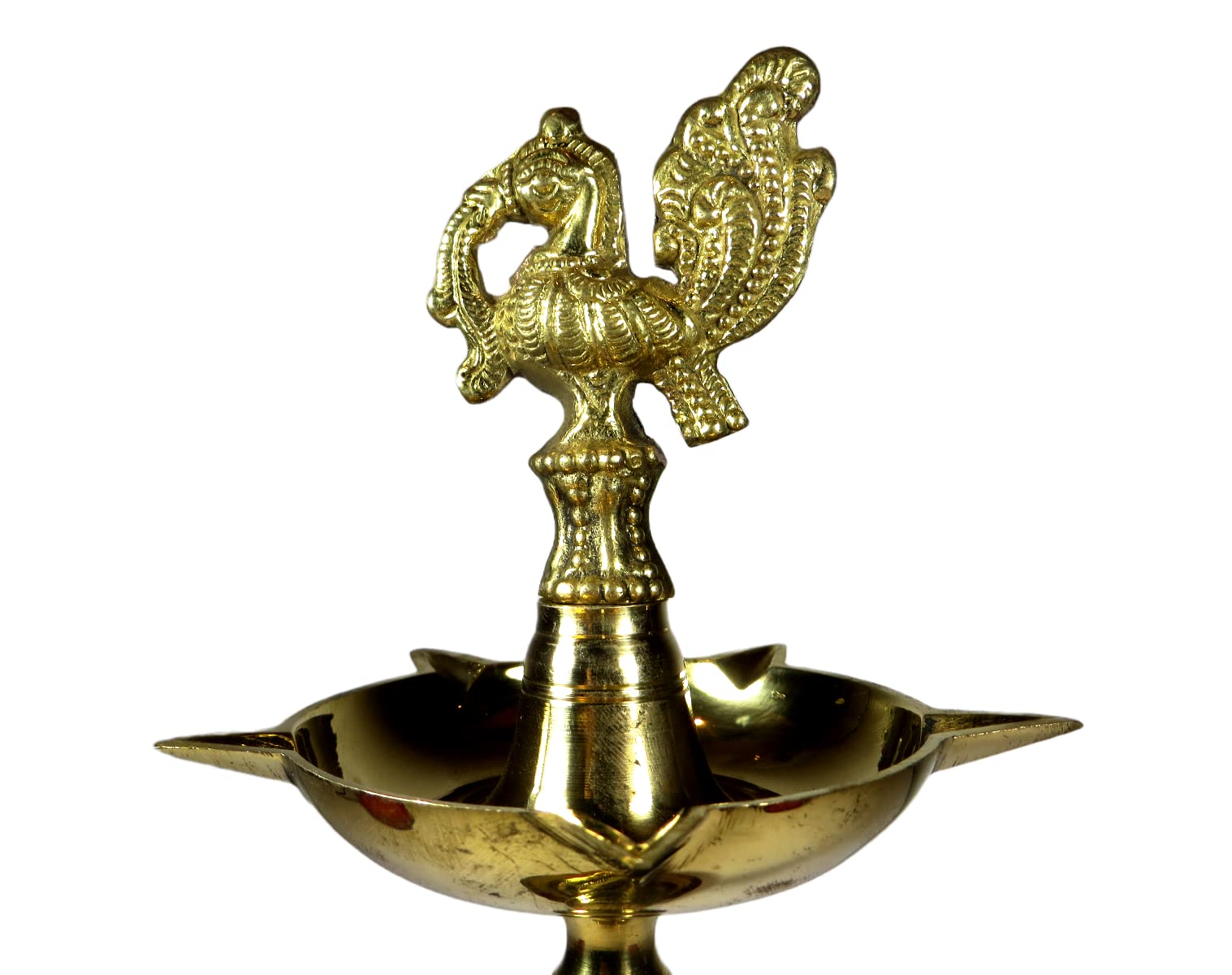 WOOD CARVING WORK Pure Brass Golden Tall Peacock-Topped KASHI SAMAI KUTHU VILAKKU Sapta (Seven Notched) DIYA/Deepam/ Jyoti/ Lamp with Stand (easily dismantlable 11 Inches)