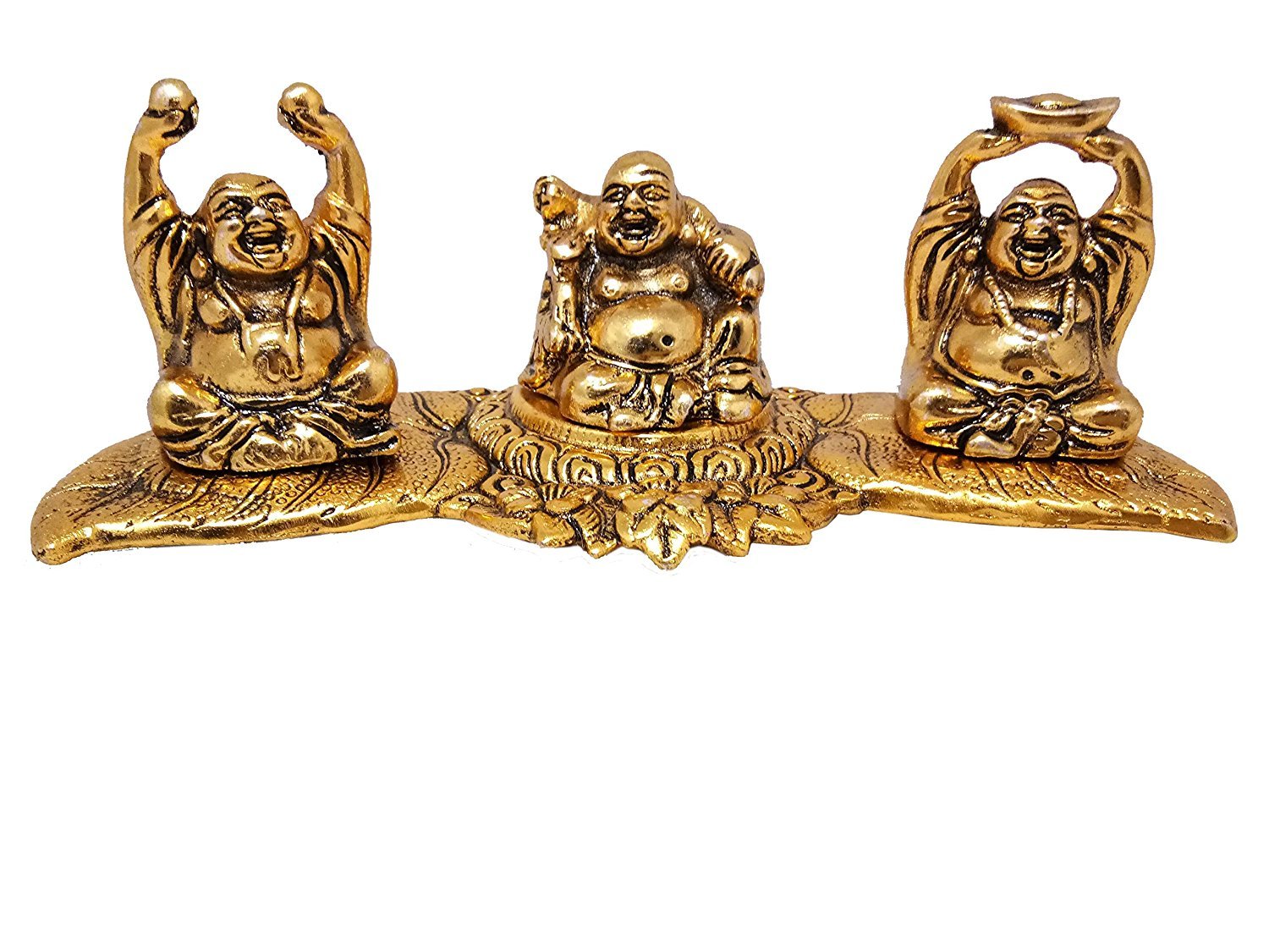 Feng Shui Set Of 3 Laughing Buddhas made from white metal with antique golden polish