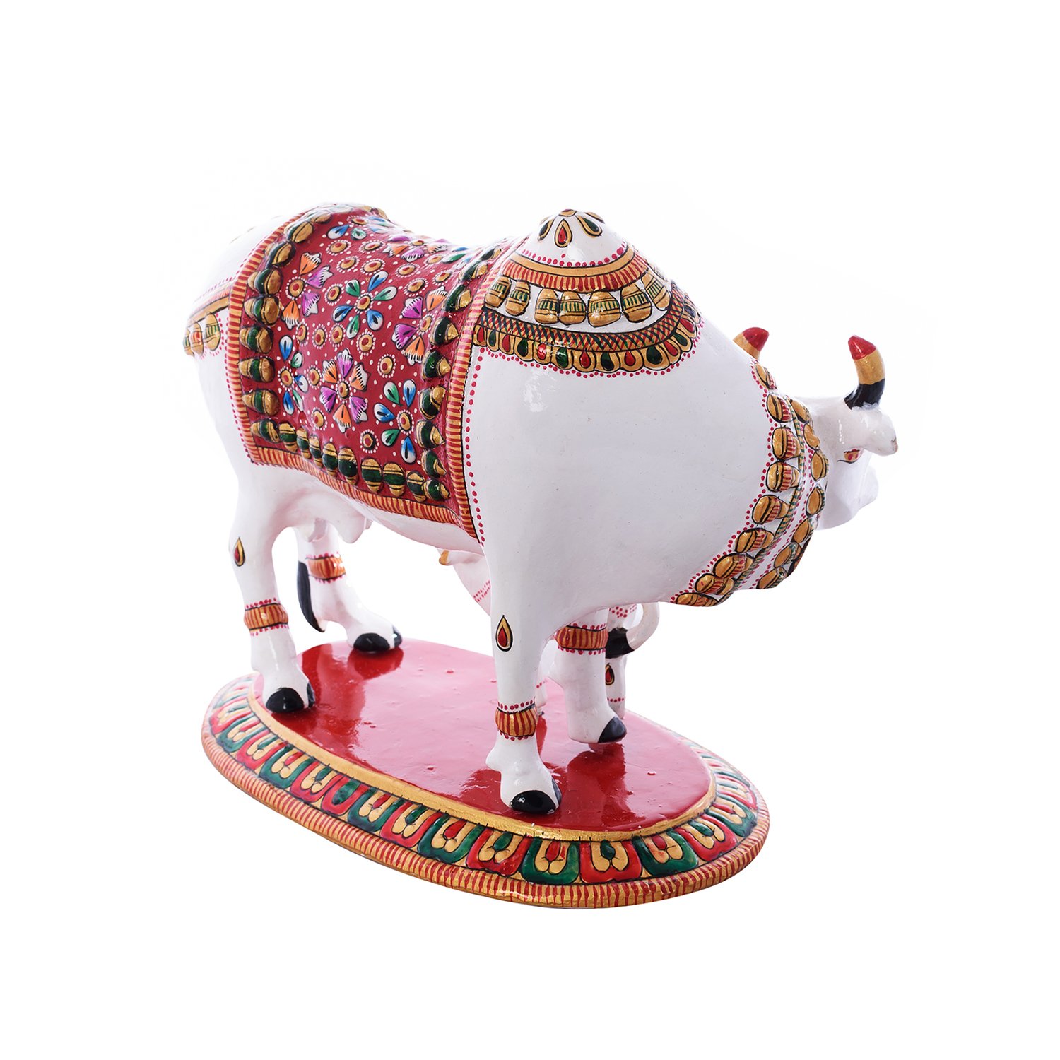 Beautiful creation of kamdhenu cow & calf is a perfect symbol of the undying aura of the holy saint that encompasses numerous devotees round the globe. This statue aptly conveys the emotions of people who consider cow (gomatha) as a motherly figure. Kamdhenu cow & calf statues are widely used for decoration purposes in homes and offices. It serves as a great gift especially around religious celebrations and festivities. This meenakari metal artifact has been made by skilled artisans from the house of eCraftIndia using various traditional techniques.