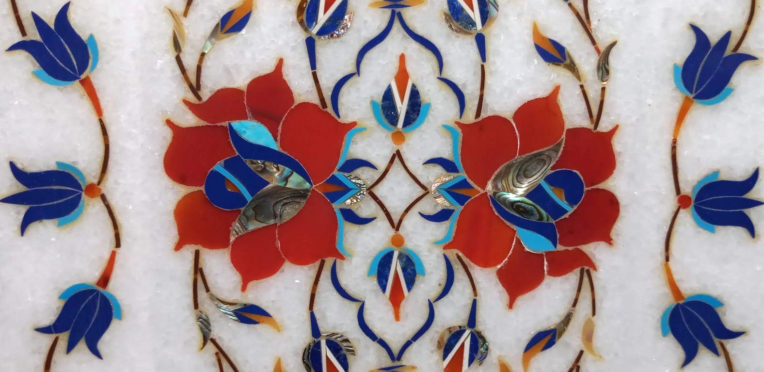 MARBLE INLAY ART AGRA - PACCHIKARI Handcrafted White Marble inlay Tray with Multicolored colors and elegant designs. The Exclusive marble tray is translucent with the light so you can place the light on the back and see Magical view. Design: Colorful Rangoli Design. We will Send you paper with Description and Meaning of the stone. To maintain this art piece simply wash Soap and water clean it with cotton cloth and apply white wax for shine. The stones inlaid into the beautiful Tray are as follows- Blue --------- Lapis Lazuli. Orange ------- Carnelian. Light Blue ---- Turquoise. Brown ------ Jasper. White ----- - Mother Of Pearl. Colorful Shiny ----- Sea Shell. It is an art piece which will be a beauty & the conversation piece at home. We are himself manufacture of this product so we do custom design and bulk order also.