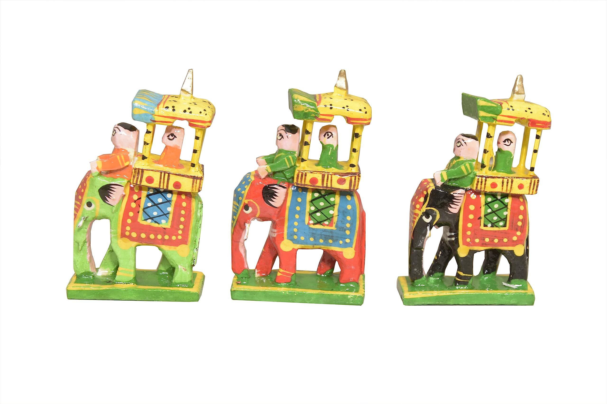 VARANASI WOODEN TOYS Wooden Mysore Ambari Multicolour Set of 6. This model looks amazing on display. Admire its distinctive colors and cool accessories. VARANASI WOODEN TOYS Mysore Elephant Ambari is made of softwood and it's lightweight. This Mysore elephant Ambari represents the Mysore Dasara Festival. One can decorate these elephants in their Living Room Drawing Room and Kids' room which will surely give the home a traditional look. One who wants to decorate their Golu in Mysore Dasara theme can decorate with these elephants. The detailed carving on wood is known as Tellaponiki which gives a very beautiful artistic look. So we can say that in Golu time these Elephants one can use to decorate Bommala Koluvu. These Indian handicrafts represent Indian traditions. size-8.5 x 2.5 x 4.5 cm clean with a dry cloth. NOTE- the handmade product may vary in color and size.
