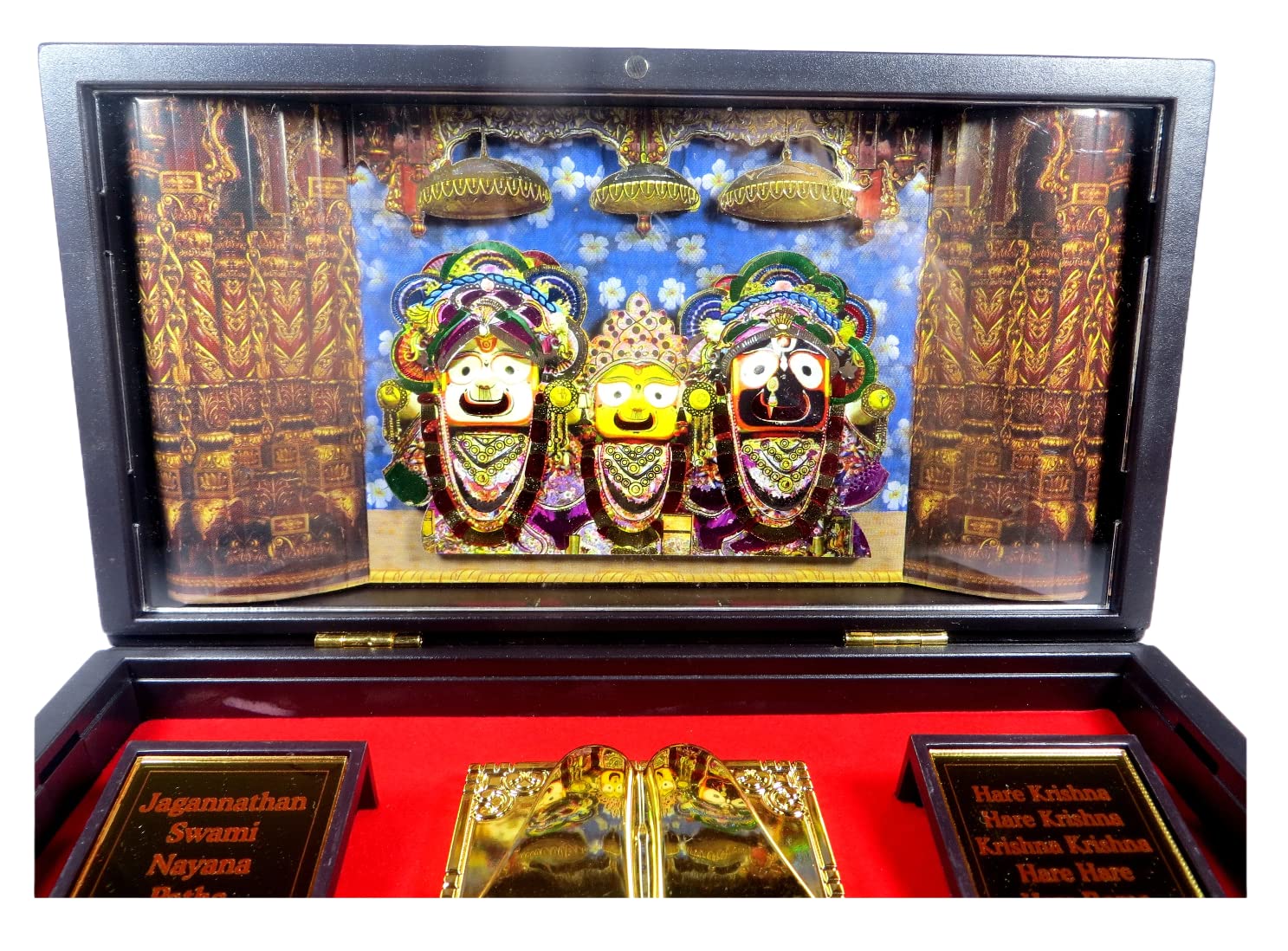 WOOD CARVING WORK Beautiful Gold-Coated 3D Footprint with Lord Jagannath Balabhadra and Shubhadra Figurines in Wooden Box with Mild Chandan Fragrance (Box Color : Chocolate Brown; Product material : Wood glass Gold plated Metal; Height: 1.5 inches X Length: 8.25 inches X Width: 4.4 inches; Weight: 330 Grams). Unique Gift for Parents Birthday Anniversary and House Warming. Elegant dcor item for office table and cash counters