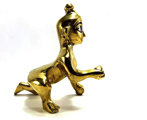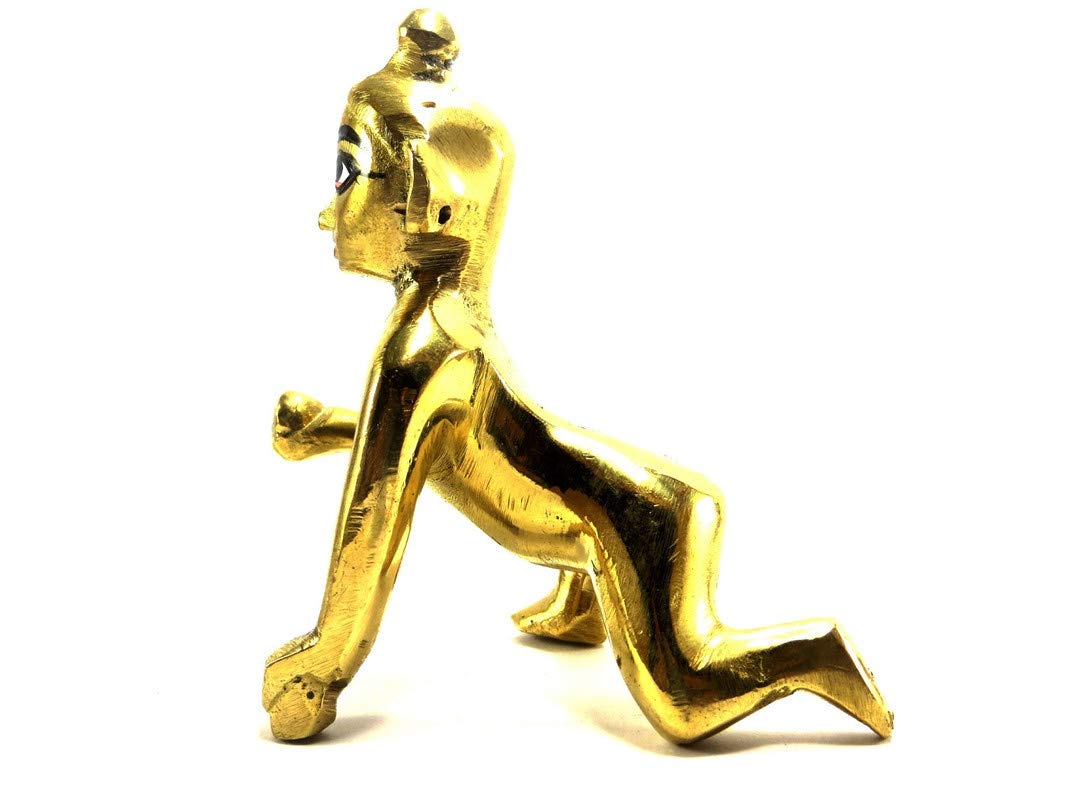 WOOD CARVING WORK beautiful pure BRASS LADDOO GOPAL BABY KRISHNA THAKURJI IDOL (murti/ idol/ figurine); specially worshipped in home temples workplaces offices desks etc. and during the auspicious occasion of Janmashtamee (around 3 x 3 x 2.7 inches; weight: around 150 grams). Ideal for gifting purposes.