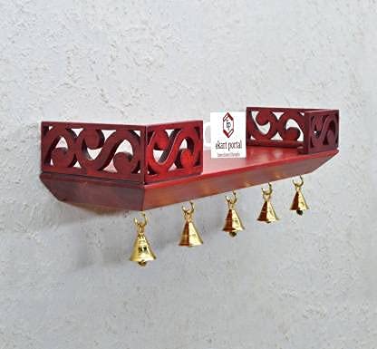 Woodkartindia temple ghar mandir shelfis made of compressed wood in premium finish style. This home temple shelf is exquisite design work on its finest quality wooden body that holds 5 decorative bells.