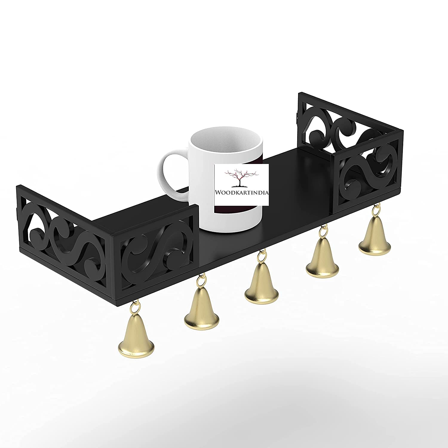 Woodkartindia temple ghar mandir shelfis made of compressed wood in premium finish style. This home temple shelf is exquisite design work on its finest quality wooden body that holds 5 decorative bells.