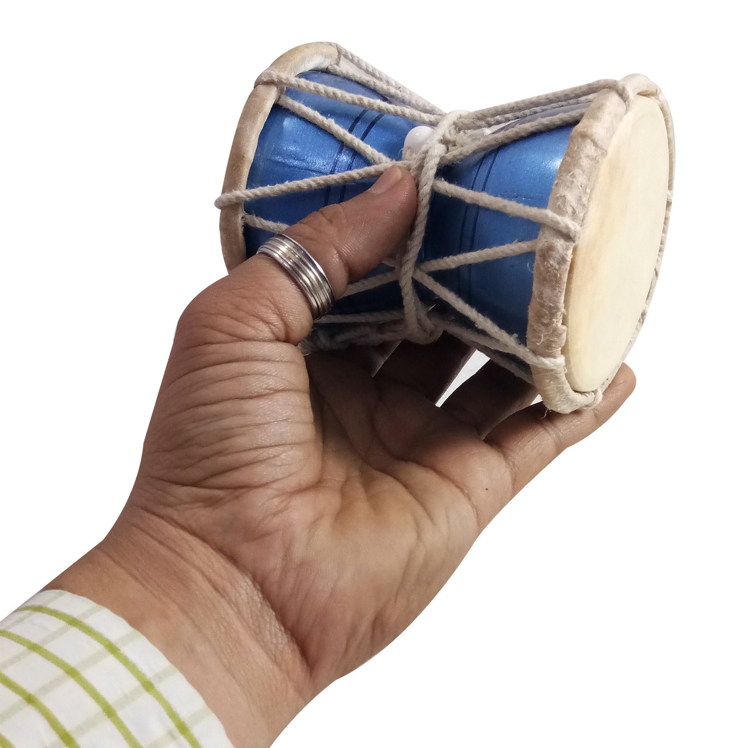 Indian Religious & Traditional Classical hand percussion Damru/Damroo is well known folk instrument for drumming in all over India. Damroo is mainly made in wood metal or skull with both ends covered by animal skin (goat skin) crossed tied-up strings or cords made from cotton leather or jute. Damru is an hour glass shaped drum typically played with the bare hands a player wave the instrument by twisting the wrist back and forth. A Damroo player adjusts the pitch of the instrument by adjusting the pressure that is applied to these strings. Damroo is associated with Hindu God Lord Shiva it is Lord Shiva favorite musical instrument that is why Damru is also known as a power drum which invokes spiritual energy