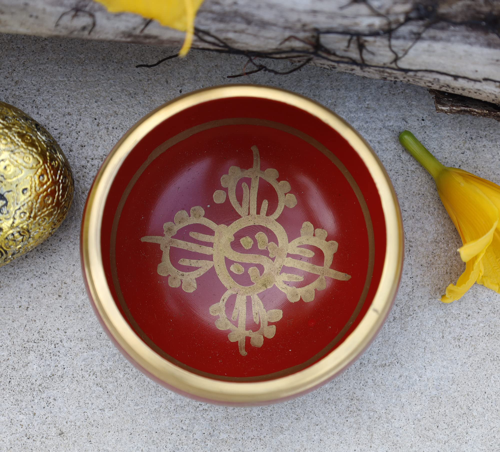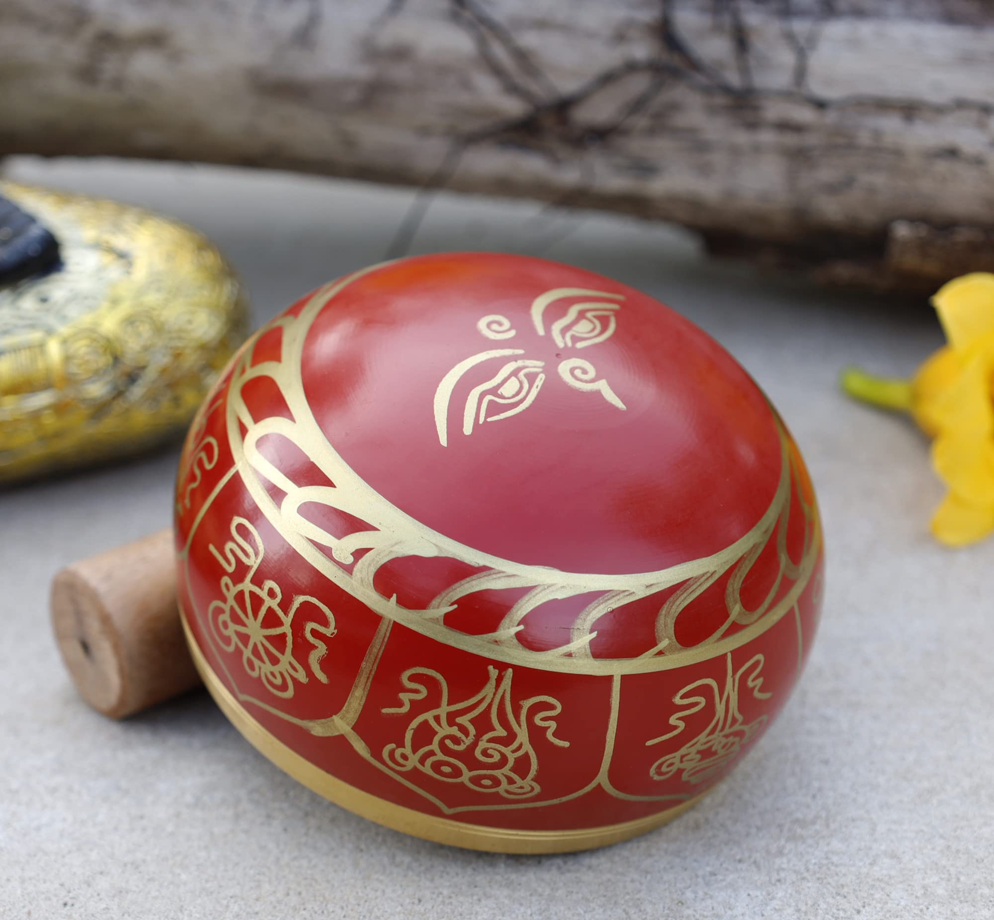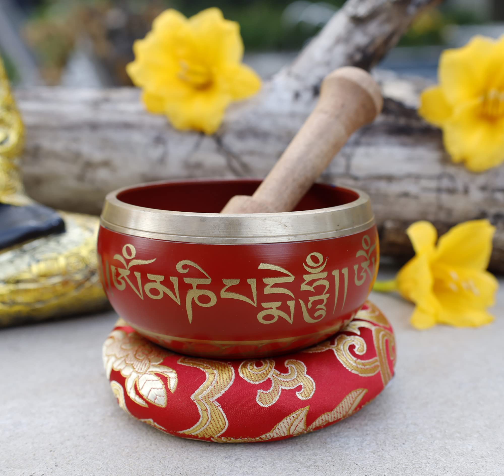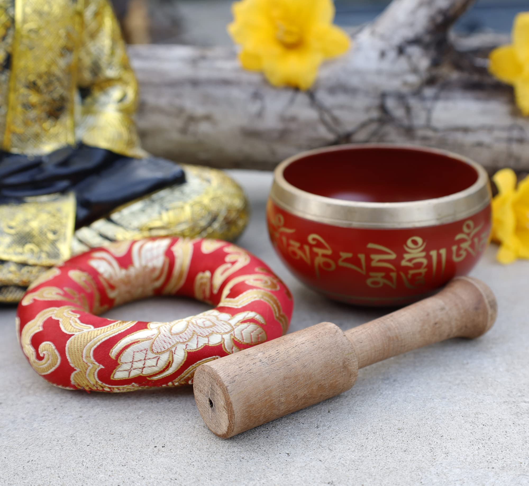 TIBETAN RITUAL CURTAIN Tibetan Meditation Om Mani Singing Bowl / Cushion / Mallet (Red)