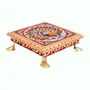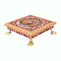 Its a beatifull designed meenakari chowki. its dimensions are 6" x 6" x 2" inces. its legs are made of brass and its uper body is of wooden with aluminum foil cover on it.