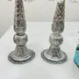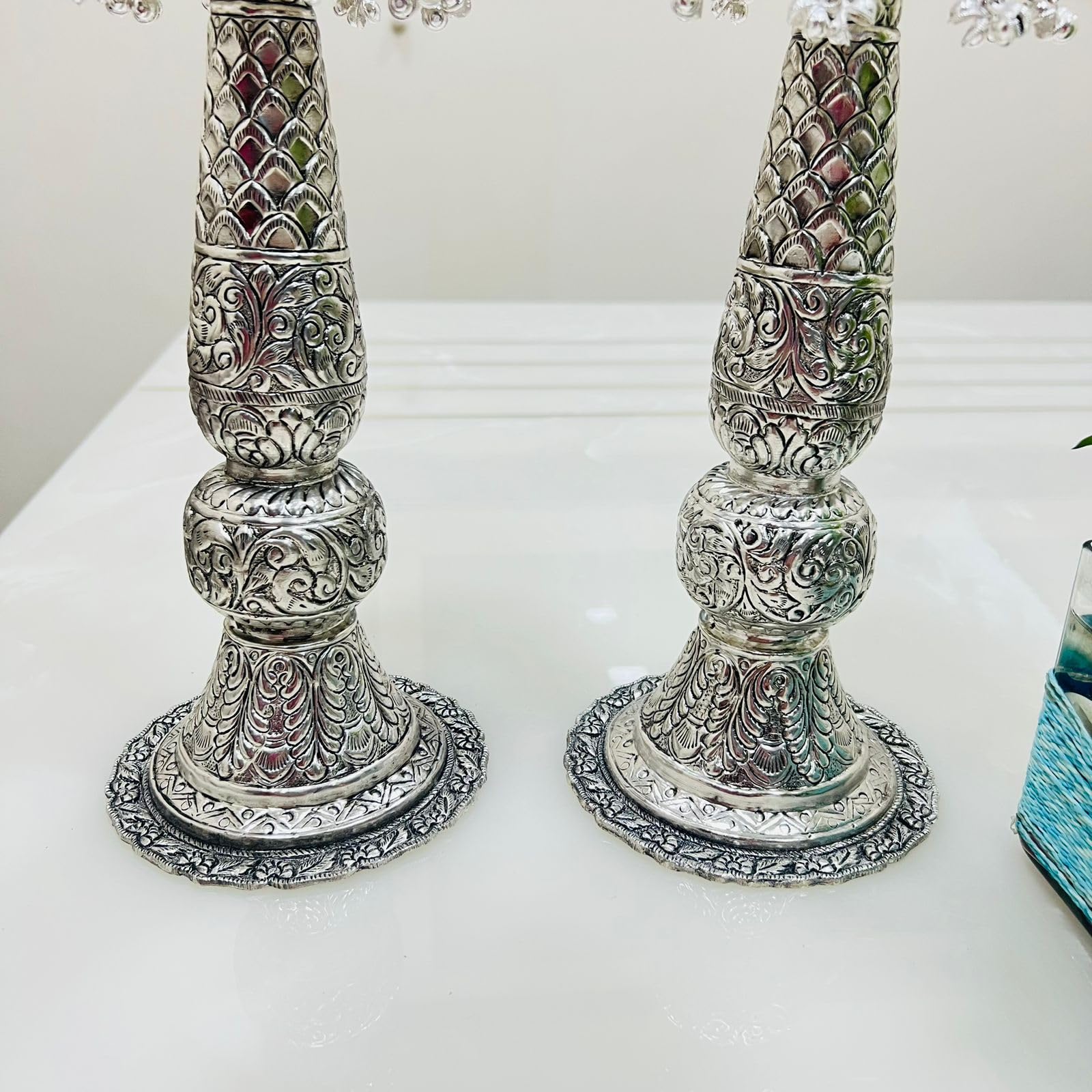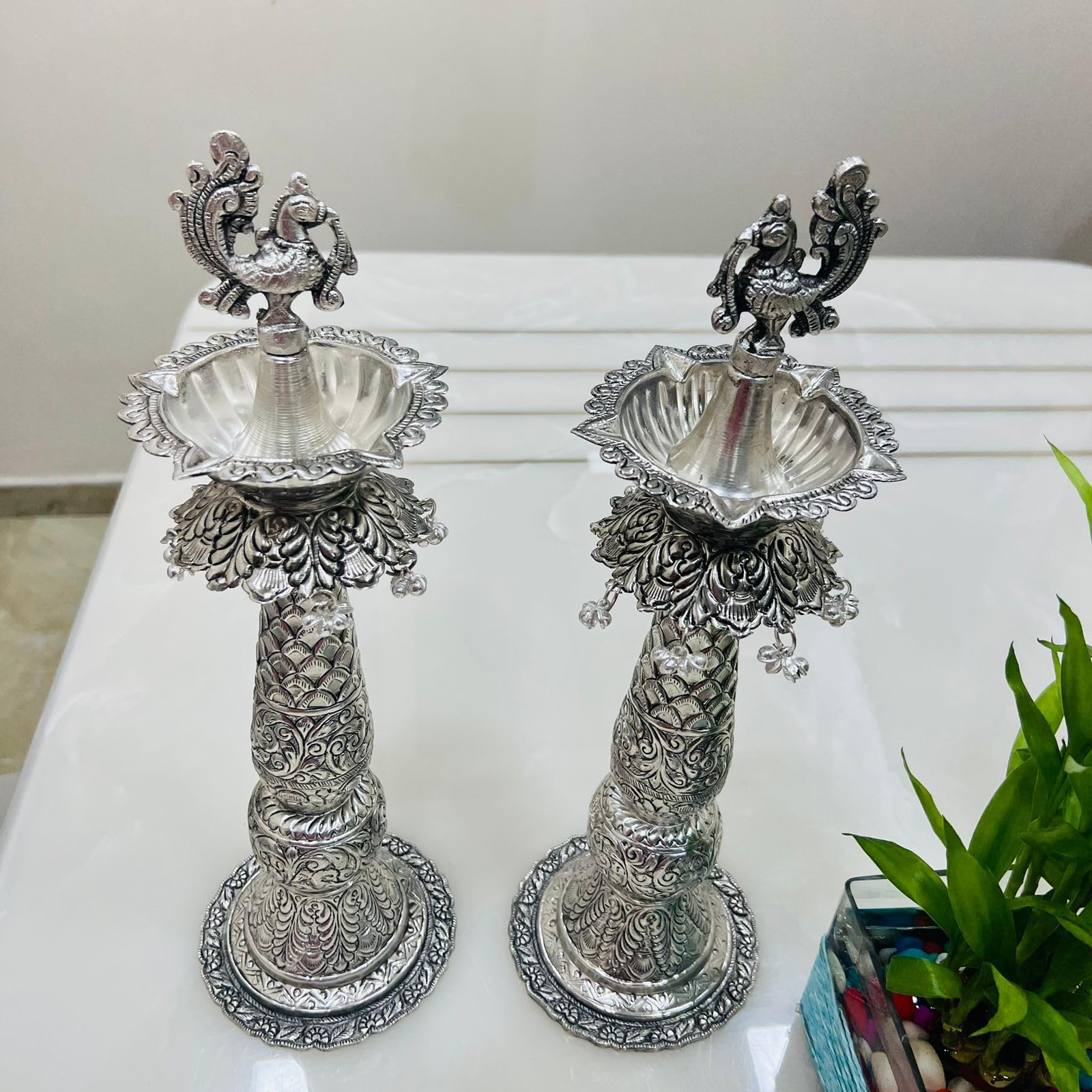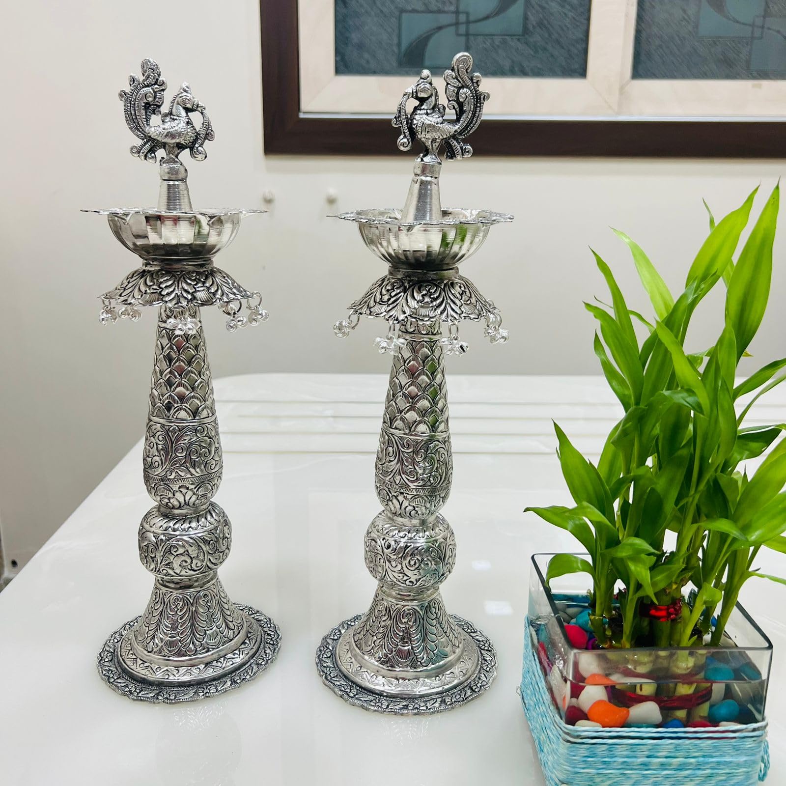 German Silver Hand Engraved Peacock Samai Pair / Diya Stand Pair for Decoration & Gifts - Pack of 2 (Size - 16 x 5 Inch)