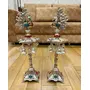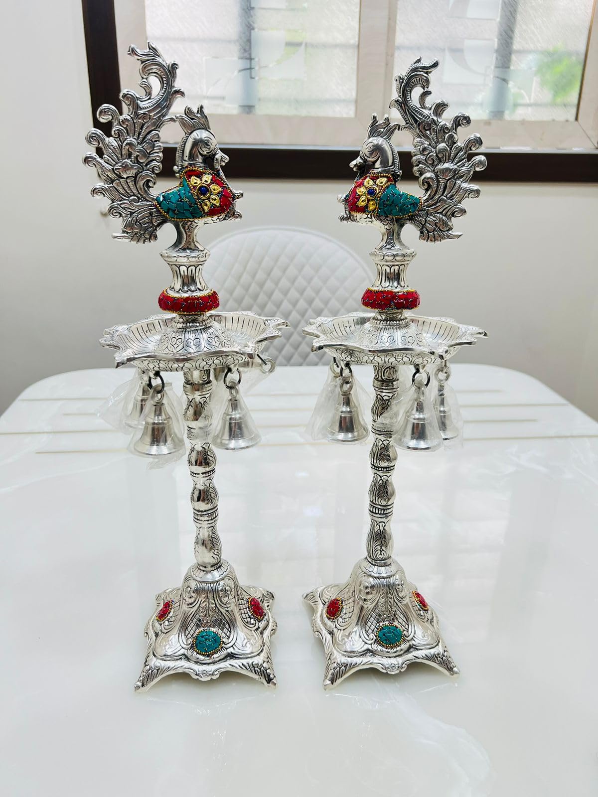 German Silver Brass Plated Peacock Samai Diya Diwali Gifts Metal Diya Handmade Indian Pooja Oil Lamp Silver Diya Lamp Akandh 5 Wick Diya Home Decor It is made from German Alloy Metal (Composition of Copper Zinc Nickel); which is finished with silver plating and "oxidized work" on its surface which gives it a "antique look". It has hand made work with beautifully hand crafting on German Alloy Metal. It is made by Metal carving work Rural India artisans who made it an accurate durable and washable product. Light up your home with this beautiful Ganesha Diya. Crafted from a quality German Silver Ganesha Figurine oil lamps add charm to the beauty. People light up these wick lamps for performing aarti of Gods they worship. These are also used as Diwali lights. Made in brass this is a solid piece of collectible figurine sculpture that you would be happy to keep at your home. Gift your loved ones this attractive Diya for special occasions. The premium bell has beautiful sound and is an essential for temple at home. This product is crafted from brass that is considered to be a sacred metal and traditionally used in prayer accessories. The sweet sound of this bell will fill the atmosphere with divine sound during any pooja / ceremony. German Silver Ganesha Samai Diya Diwali Gifts Metal Diya Handmade Indian Pooja Oil Lamp Silver Diya Lamp Akandh 5 Wick Diya Home Decor Illuminate your home with the enchanting beauty of our German Silver Hand-Engraved Peacock Samai/Diya with Bells. This exquisite piece combines traditional craftsmanship with elegant design creating a mesmerizing addition to your festive decorations or everyday ambiance. Crafted with meticulous attention to detail our samai/diya showcases the artistry of skilled artisans. Made from premium German silver it boasts a radiant shine and durability that will withstand the test of time. The intricate hand engravings on the surface depict a graceful peacock motif symbolizing beauty prosperity