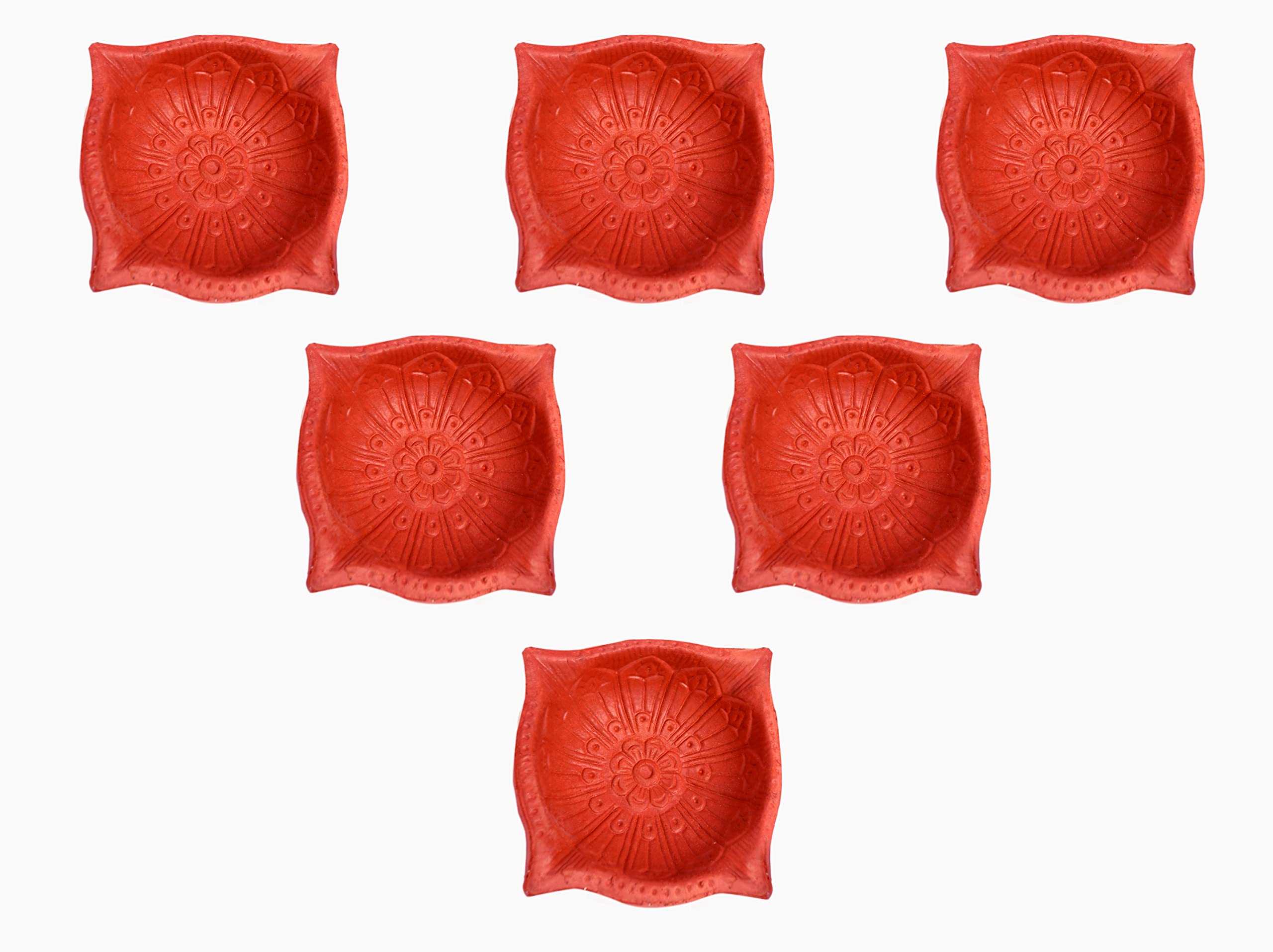 Festive Vibes Handmade Designer earthren Clay Diya Four mukh mukhi batti Diya Oil lamp Terracotta Diya for Diwali Pooja Decoration Set of 6 pics Deepak Diya with 1 Packet Long Wicks Packet
