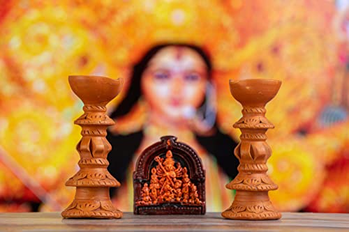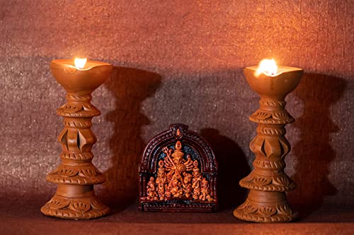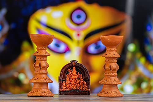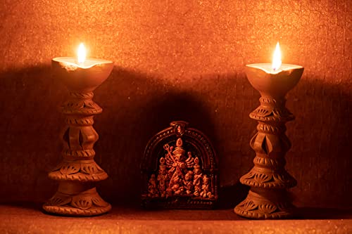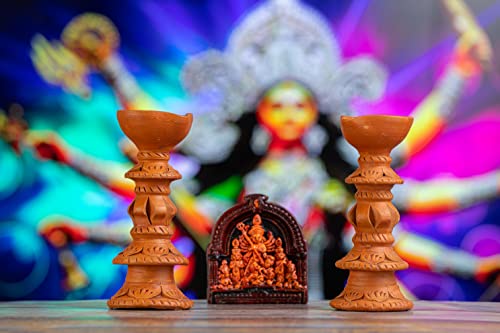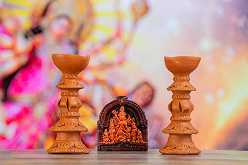 Karru Krafft Handcrafted Terracotta Stand Large Diya/Pilsuz Diya Set of 2 and Durga Idol for Pooja Decor Festive Decor Diwali Decor Home Decor Home Lighting Festive Gifting