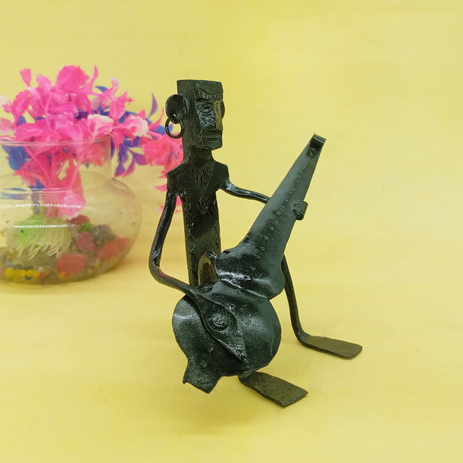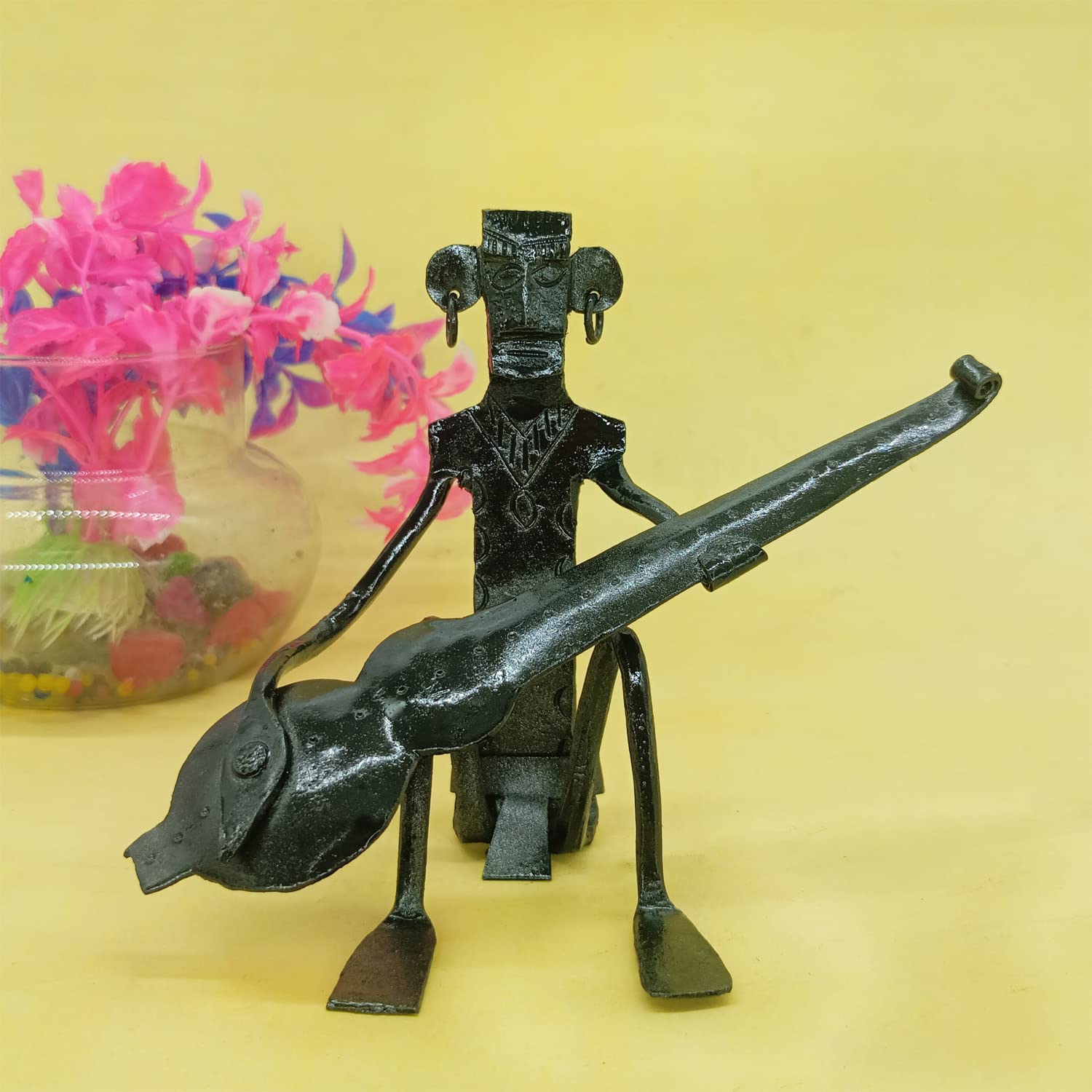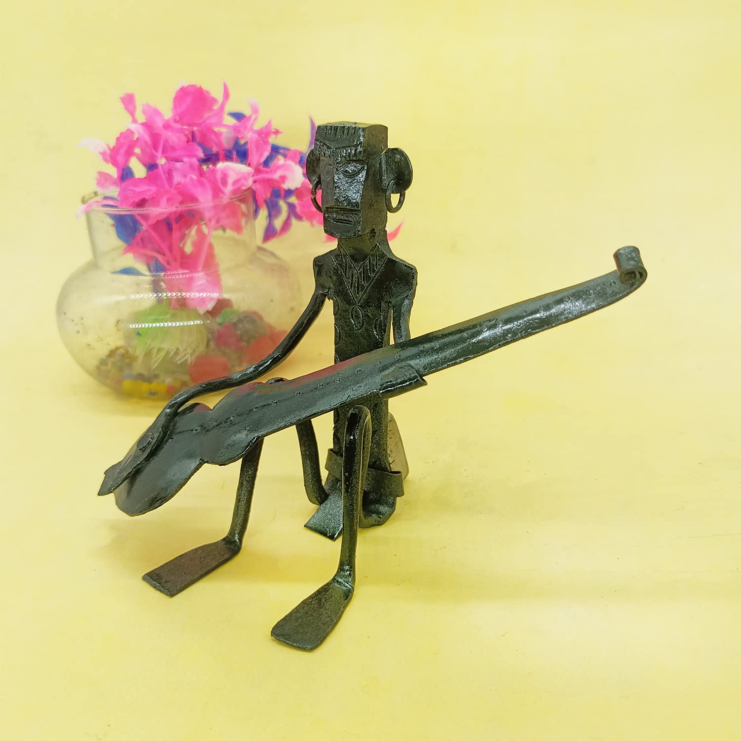 DHOKRA CRAFT brings you this decorative wrought iron musician man showpiece. Simplistic modern and yet seeped in history and tradition this becomes a perfect gift option for music lovers functions or events. Uniquely handcrafted by using a single sheet/piece of wrought Iron which showcases the mesmerizing crafting abilities of tribal artists of Chhattisgarh. Lohshilp (Wrought Iron Craft) is one of the most unique and oldest craft forms of Bastar. Over the years the craft has evolved into a revered art form. Crafted by the tribal artisans of Chhattisgarh (Wrought Iron art of Chhattisgarh) . Please note: Due to various types of lighting and flash used while photo shoots the colour shade of the product may vary.