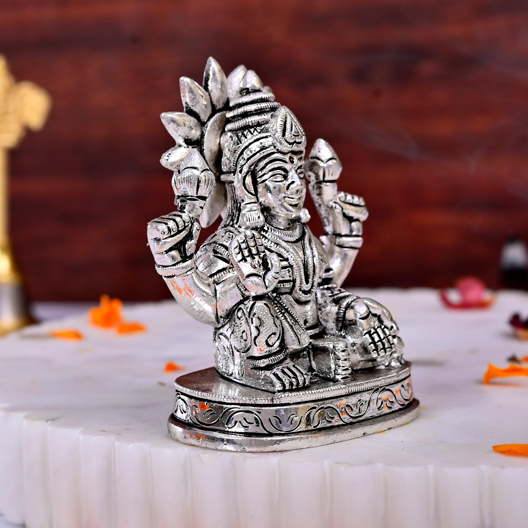 Bring the blessings of wealth prosperity and well-being into your home with this beautifully crafted Laxmi Idol Murti. Known as the fortune and abundance Laxmi who grants prosperity material wealth and happiness. This stunning silver-polished Laxmi Murti is an ideal piece for your pooja room or temple space a small yet powerful symbol of grace and divine blessings. The intricately designed Laxmi Murti is not just a sacred idol but a work of art that reflects the devotion and skill of traditional artisans. The radiant silver finish enhances the beauty of the idol making it a captivating addition to any spiritual or decorative setting. Perfect for homes offices or temples this small-sized Lakshmi statue serves as a constant reminder of the divine blessings of prosperity and spiritual abundance.