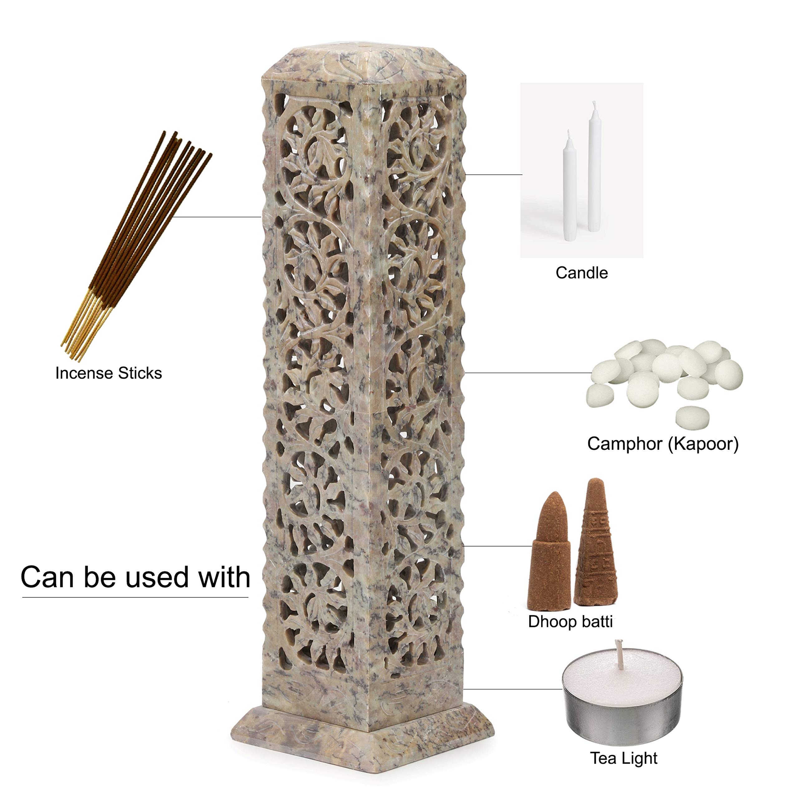 MARBLE INLAY ART AGRA - PACCHIKARI Soapstone Hand Carved Floral Design Incense Holder With 6 Incense Sticks (11 Inch_Chandan Fragnance)
