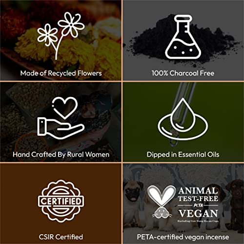 PURE INCENSE FOR POOJA : These incense sticks dhoop cones and dhoop sticks are made from sacred RECYCLED FLOWERS and dipped in 100% NATURAL ESSENTIAL OIL.