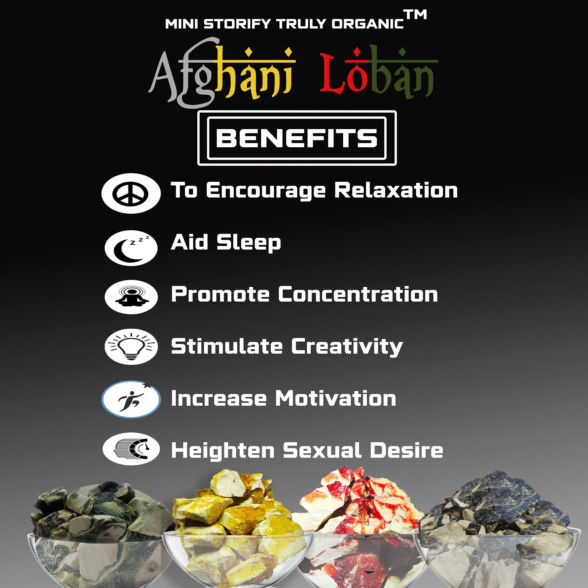 • Mini Storify Truly organic Afghani loban which Increase the Positivity and spirituality. Whether You want it for Spiritual Purpose (Havan Pooja) or just need to relax your mind and body You Can Use this powerful chemical free natural pure afghani loban.