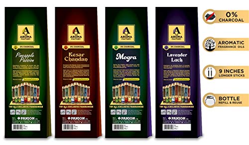 Style:Pineapple Mogra Lavender & Chandan SandalThe Aroma Factory Pineapple Mogra Lavender & Kesar Chandan Sandalwood Incense Sticks Agarbatti {& } (Pack of 4 x 30 sticks) Experience the Soothing Scent of Exclusive Incense Sticks Agarbatti by The Aroma Factory - A Quality product by Panjon Limited. . Made with Natural Essential Oils and Content indulge in the Soothing Aroma of Incense Sticks by The Aroma Factory. Try all fragrances of Agarbatti and Dhoop Batti by The Aroma Factory : Chandan Loban Gugal Mogra Rose Lavender White Sage Sandalwood Attar Jannat Ul Firdaus Mantra masala Chocolate Green Apple Strawberry Pineapple Jasmine.Incense Sticks Agarbatti sandalwood agarbathi agarbati dhoop dhoopbatti dhoopbati dhoop batti agarbathies incensestick incensesticks incense aroma pooja puja . Suitable for gifting : Add more aroma to your loved ones life by getting them these fragrance sticks on occasions such as Diwali Rakhi and other festive events. 100% Quality Assured.