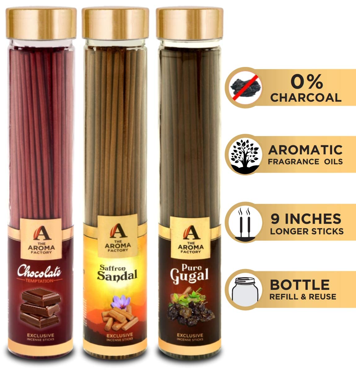 The Aroma Factory Chocolate Kesar Chandan Saffron Sandal & Gugal Incense Stick Agarbatti (Zero Charcoal & 100% Herbal) Bottle Pack of 3 x 100 Experience the Soothing Scent of Exclusive Incense Sticks Agarbatti by The Aroma Factory - A Quality product by Panjon Limited. Fragrances specially curated to Rejuvenate your Senses and Calm your Soul. Made with Natural Essential Oils and 0 percent Charcoal Content indulge in the Soothing Aroma of Incense Sticks by The Aroma Factory. Try all fragrances of Agarbatti and Dhoop Batti by The Aroma Factory : Chandan Loban Gugal Mogra Rose Lavender White Sage Sandalwood Attar Jannat Ul Firdaus Citronella Patchoulli Chocolate Green Apple Strawberry Pineapple Jasmine.Incense Sticks Agarbatti sandalwood agarbathi agarbati dhoop dhoopbatti dhoopbati dhoop batti agarbathies incense stick incense sticks aroma meditation pooja puja charcoalfree. Suitable for gifting : Add more aroma to your loved oneâs life by getting them these fragrance sticks on occasions such as Diwali Rakhi and other festive events. 100% Quality Assured.