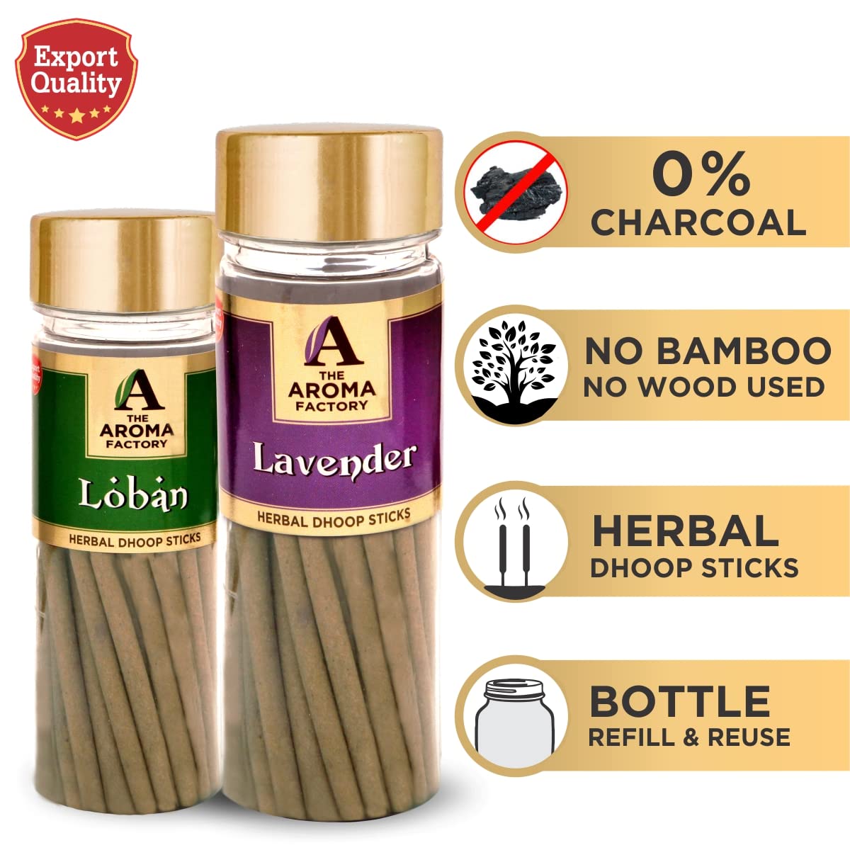 • LONG LASTING: The Aroma Factory Dhoop Batti Sticks Lavender & Loban (0% Charcoal) Free Incense Holder (2 Jar x 100g) contains long lasting fragrance to relax your senses